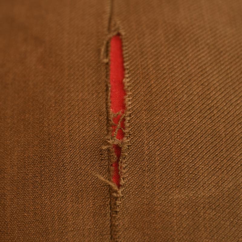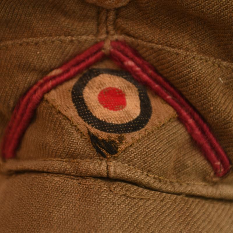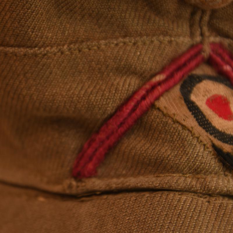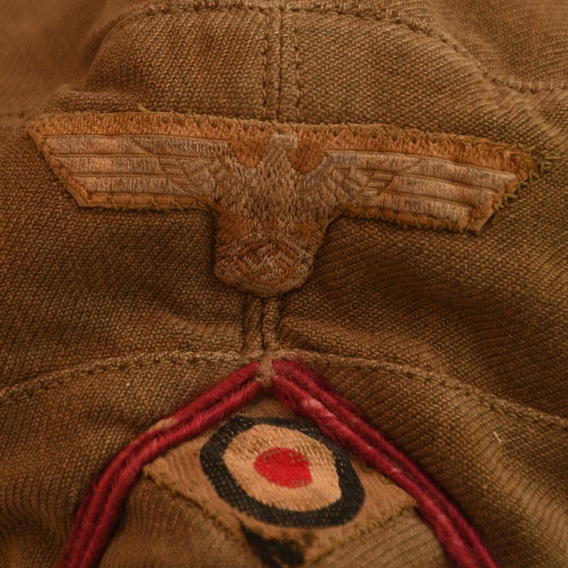 A rare arm of the service for North Africa, standard DAK field cap. Faint traces of markings evident to the red lining with the maker of ‘Carl Halfer’ with size stamping of ‘56’. There is evidence of service wear, the seam of the crown of the hat has split for a length of 6cm otherwise the cap is undamaged, complete with its correct Bevo woven eagle on tan background with matching cockade factory applied in the correct configuration for the factory of Carl Halfer being machine zigzag stich applied, still having the inverted V waffenfarbe (soutache) of smoke troops (Nebelwerfer) being bordeaux wine red also applied in the correct Carl Halfer format.