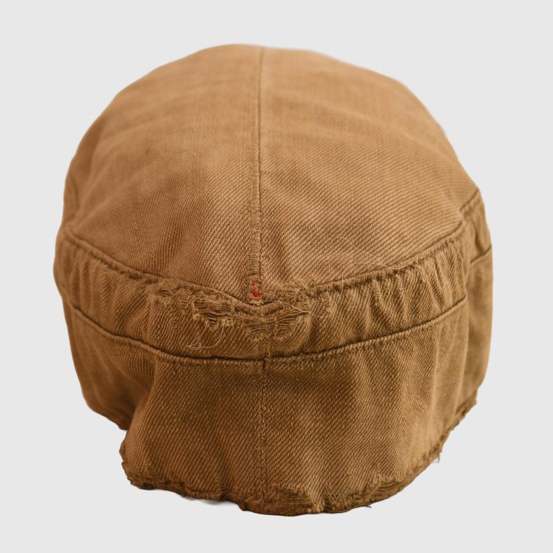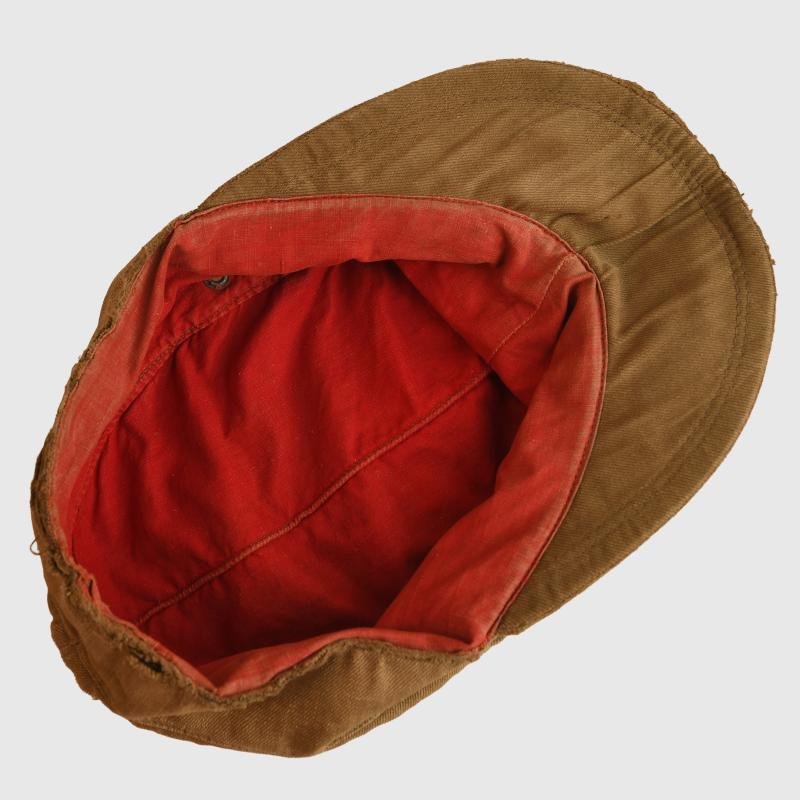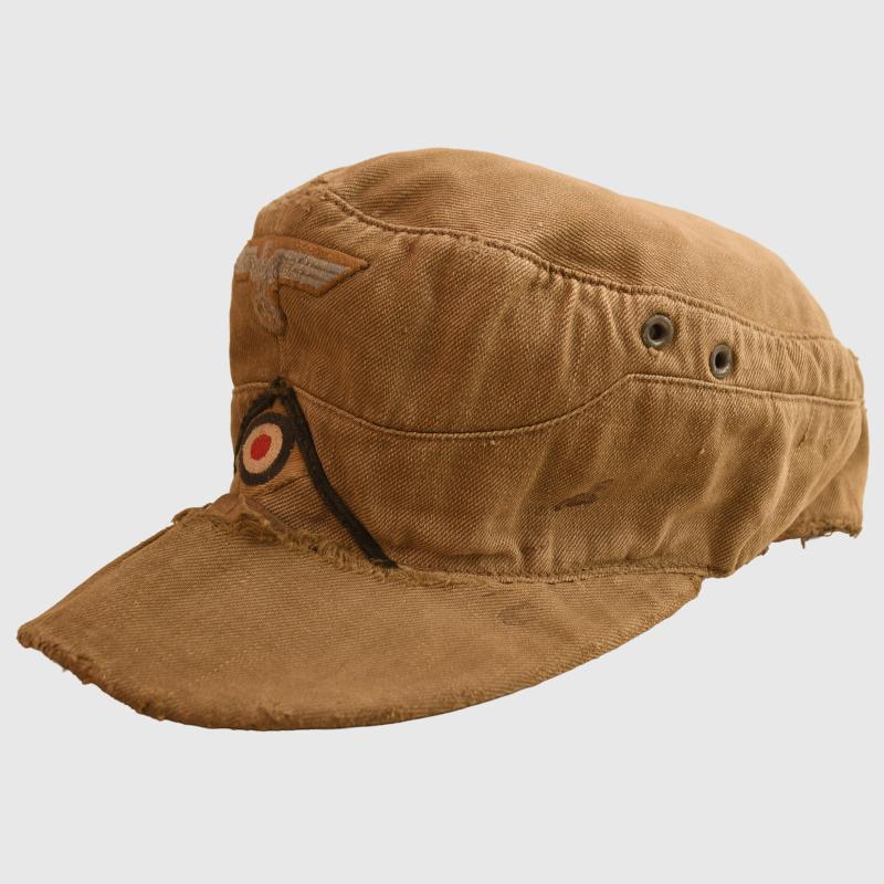 A well service worn example of the classic Afrikakorps enlisted mans visored field cap. Although not size stamped, possibly size 54 or 55. Faint traces of maker’s stampings to the inner red lining but not visible enough to decipher the maker or the actual size. To the exterior there is slight bleaching, the hat is complete with its untouched Bevo woven light tan on blue eagle and matching correct pattern cockade with the black pioneer inverted V waffenfarbe. Much shredding and degrading to the cap at the very rear upper point of the main body, the rear lower bottom edge of front peak trim and severe shredding in the area where the material covering the peak butts up against the main body of the cap, the cardboard former for the peak is visible at this point. Complete with both its correct zinc eyelets on both sides of the cap. A rare example of the pioneer worn Afrika Korps field cap.