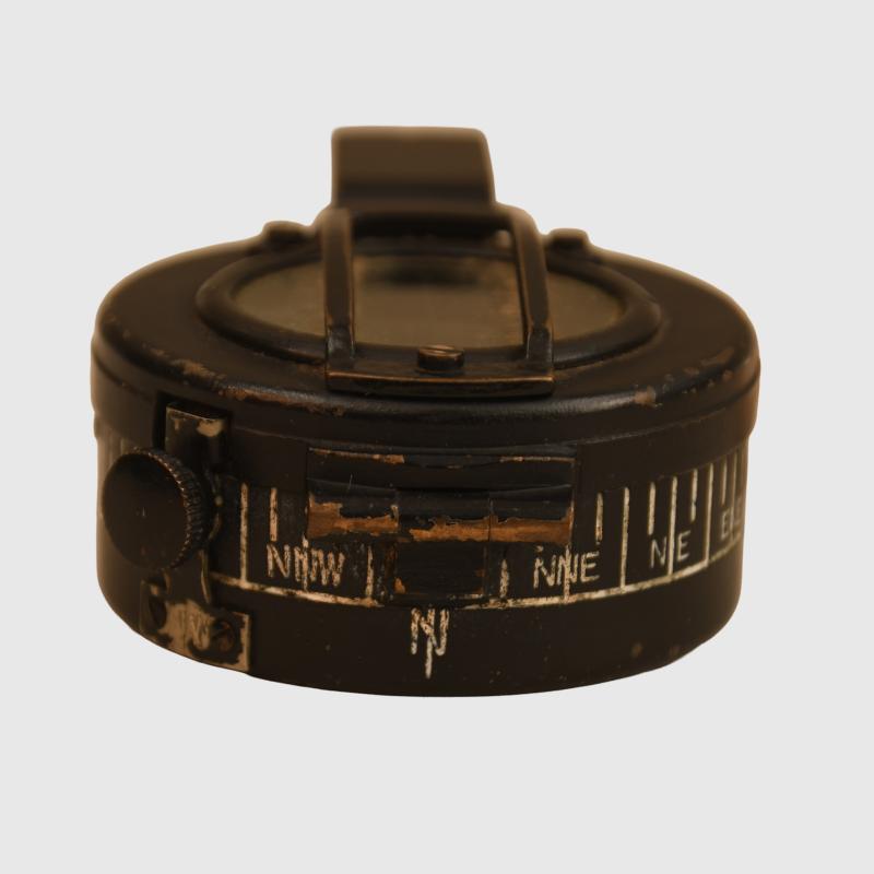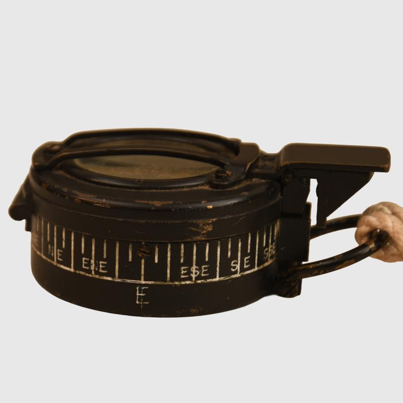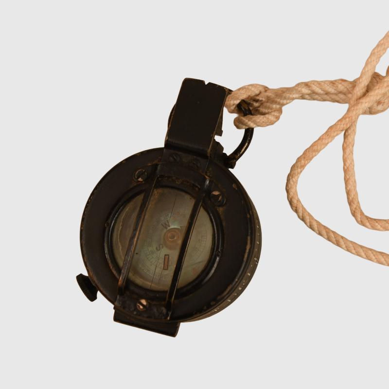 A very nice condition 1942 dated marching compass London maker marked, various issue numbers and broad arrow mark, the compass is fully functioning with all of its water complete with its scarce white rope lanyard.
