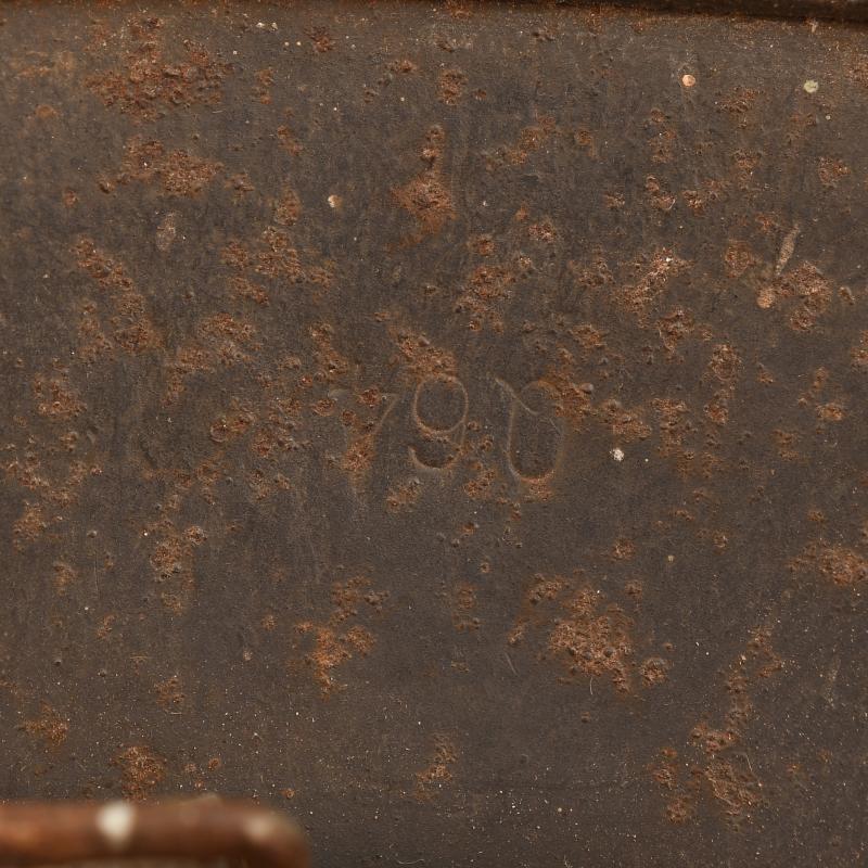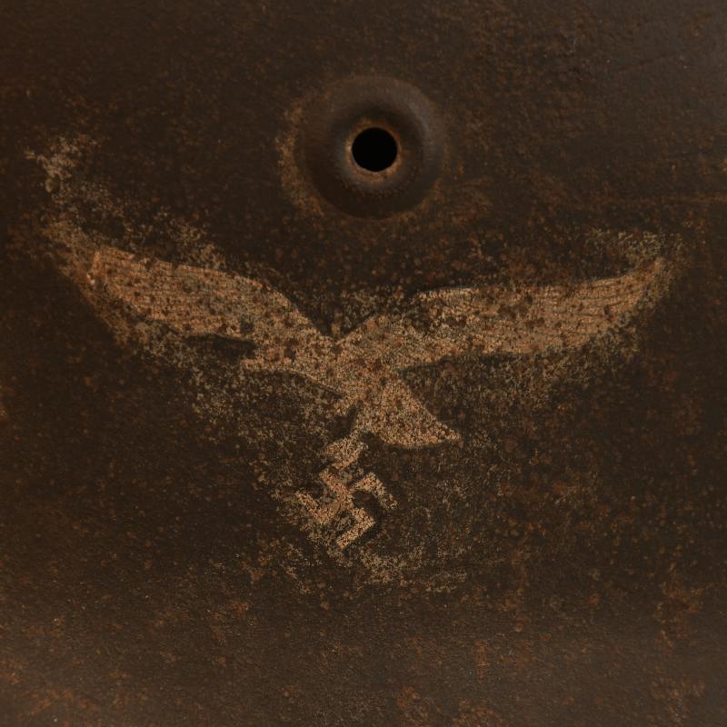 A Q64 manufactured shell, that has faint traces of a camouflage over paint which has at some stage been removed, when originally camouflaged the Luftwaffe eagle was left intact to be viewed in a triangular form. To the interior the size 56 light tan leather liner in generally clean condition all tongues present, liner band is the M 40 zinc type, chinstrap missing.