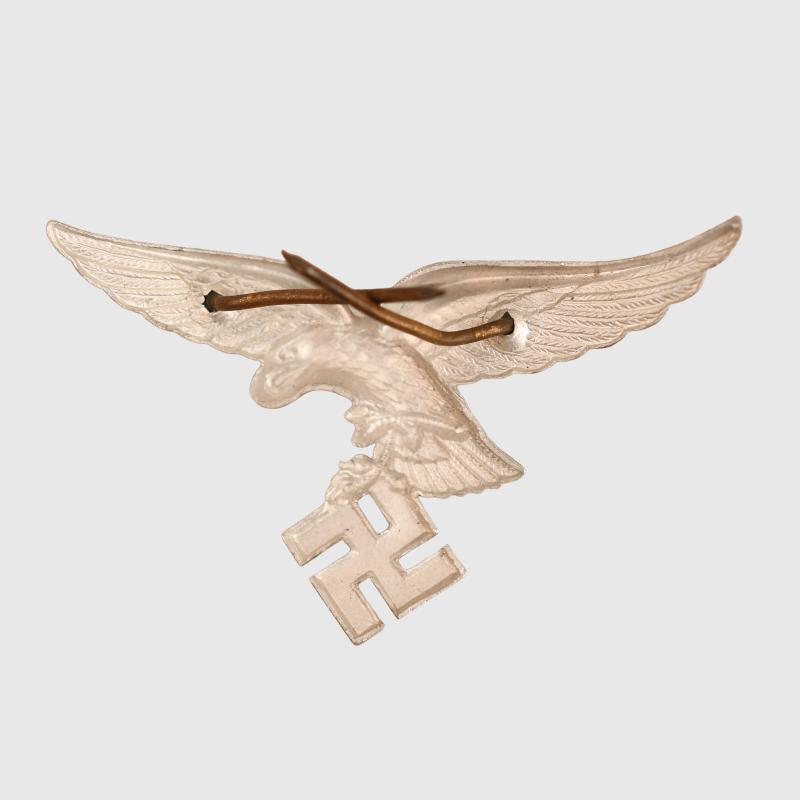 A mint unused example of the stamped aluminium short winged droop tailed eagle for the Luftwaffe NCO or enlisted man’s visor cap, both fitting prongs present.