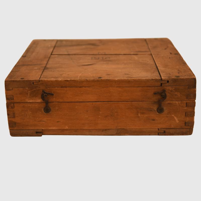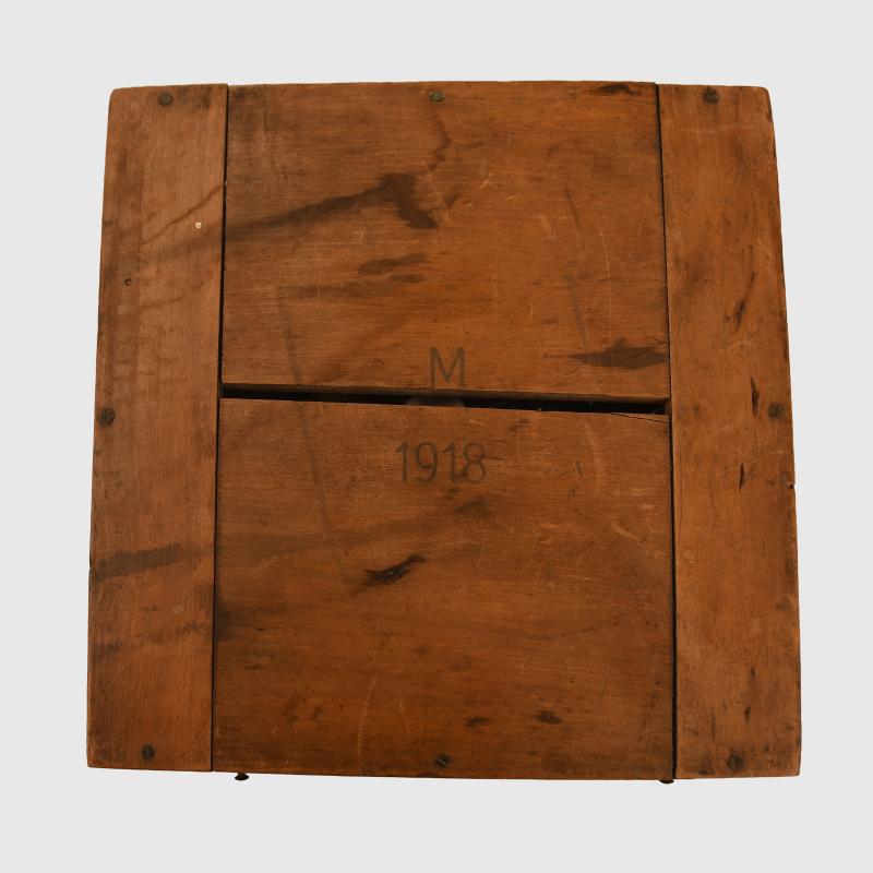 Brass 8 inch calibrated gauge, blacking sighting arm marked ‘F.N.4637’ on the swivel, maker marked ‘Nautische Werkstatten GMBH Kiel’ on the underside of the raised sight, in its original wooden case 8.5 inches x 8.5 inches, stamped lettering to the exterior ‘M 1918’.
