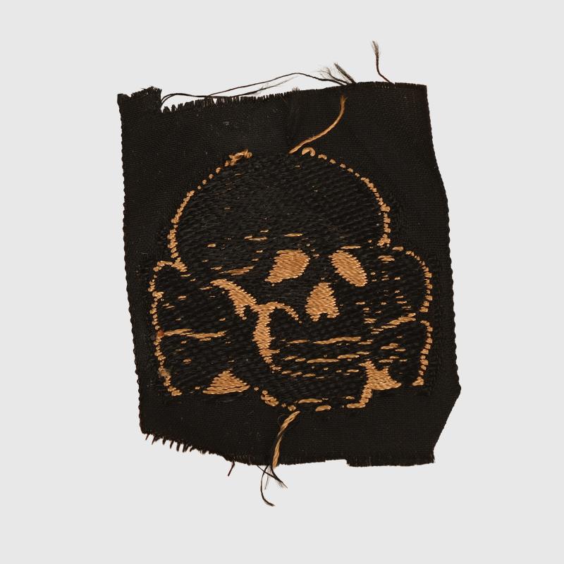 The Bevo woven cut skull from roll, for the Waffen SS M 43 cap slightly tan coloured weave to the skull with black surround.