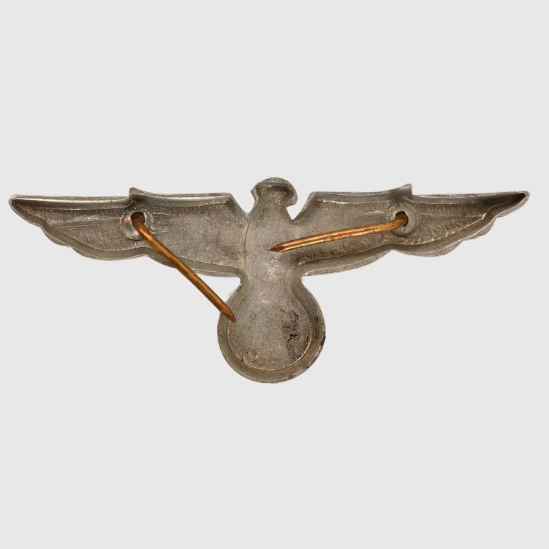 A difficult to find eagle of the Third Reich being the stamped aluminium eagle for the Bahnschutz visor cap, both fixing prongs present.