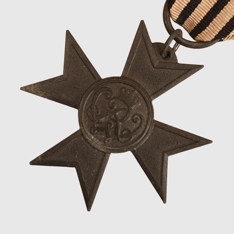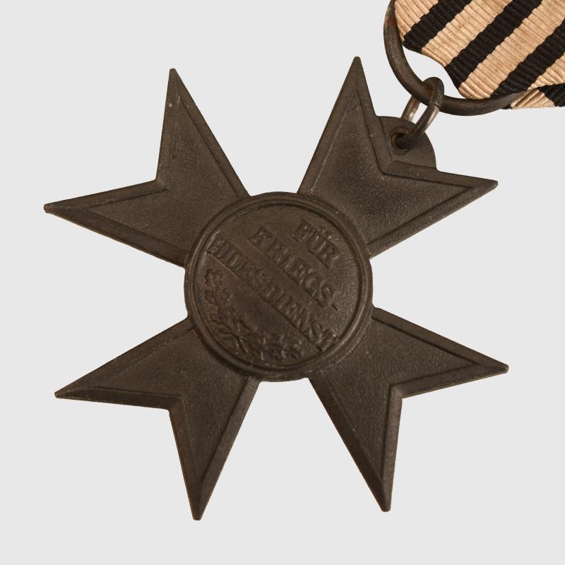 A good example, fine strike, with a very short section of faded and slightly shredded black, white and red ribbon.