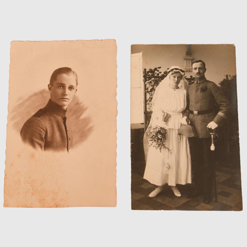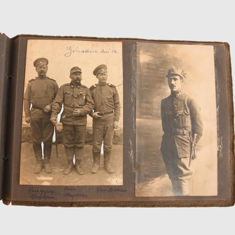 A small album of a German driver both on the Western and Eastern Fronts of WWI. The album contains 47 images, French scenes around the Verdun with German soldiers, observation balloons being used over the battlefield, an interesting shot of Jager Zu Pferde soldiers wearing gas masks, trench scenes, officers identified, a large format picture of what appears to be an Austrian soldier lying dead, a destroyed airship, burning railway stations in Warsaw. At the rear of the album is a mounted Cossack officer dated 1916 plus captured Bulgarian officers with an Austrian officer. Accompanying the album are both the Wehrpass and the soldier of Feldwebel Richard Hubner. It is very difficult to obtain both the Wehrpass and the Soldbuch of the same soldier, especially in WWI. Both books are profusely filled out with many inlaid documents. He was also attached at one stage to the Prussian Flying Station at Cologne. Accompanying the two passes are a huge amount of other documents including citations to the Iron Cross 2nd class, the Bulgarian WWI Service Award, which was awarded in 1939, a Third Reich awarded 1914 War Honour Cross, a certificate for an award from the City of Bremen plus other related military documents from the period. Also wedding photographs of Hubner dated ‘30th March 1918’ in full military uniform with his wife. An interesting and identified documentation and album group.