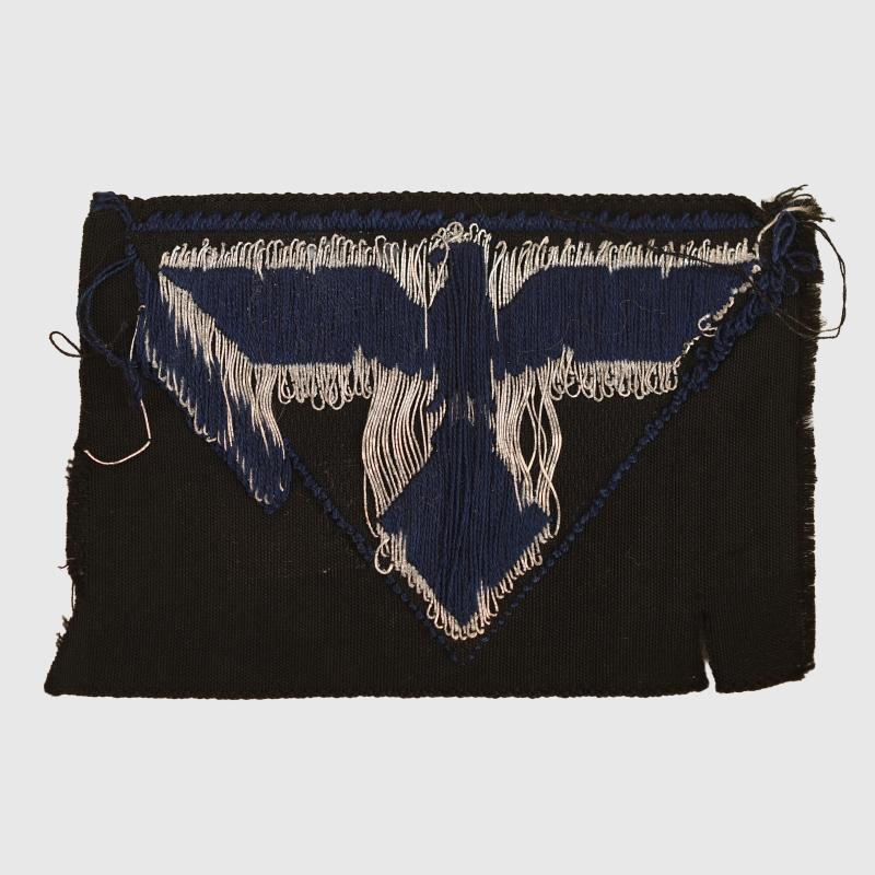 Very nicely Bevo woven in silver wire on a navy blue background, cut from roll, for the Teno overseas cap. Bevo woven ‘Ges Gesch’ to the material.