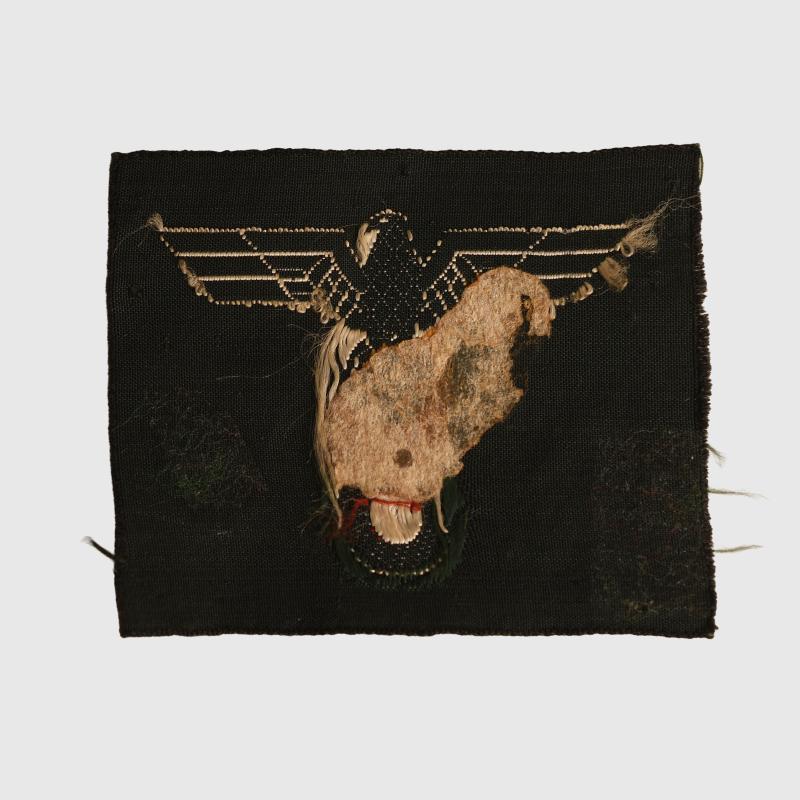 The combined Bevo woven silver eagle and cockade for the Army M.43 cap. Cut from roll. Remains of a collectors glue on the reverse side.