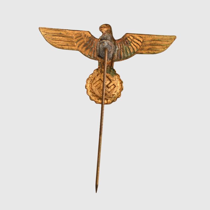 Reichswehr cap eagle in gold with a wingspan of 48mm in width. Nice gilded frosting remaining to the swastika and wreath, with its twisted and grooved pin fixing for the navy deck cap.