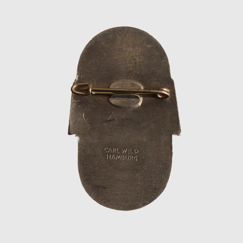 A nicely constructed in aluminium oval shaped tinny with the engraved lettering 'Meine Erste' over an art deco style eagle with large block capitals 'TAT'. Below the eagle 'Gau Hamburg' with the date 1936/37. Maker marked 'Karl Will Hamburg' on the revere side, with its tinny type construction. We cannot remember coming across a tinny such as this in the past.