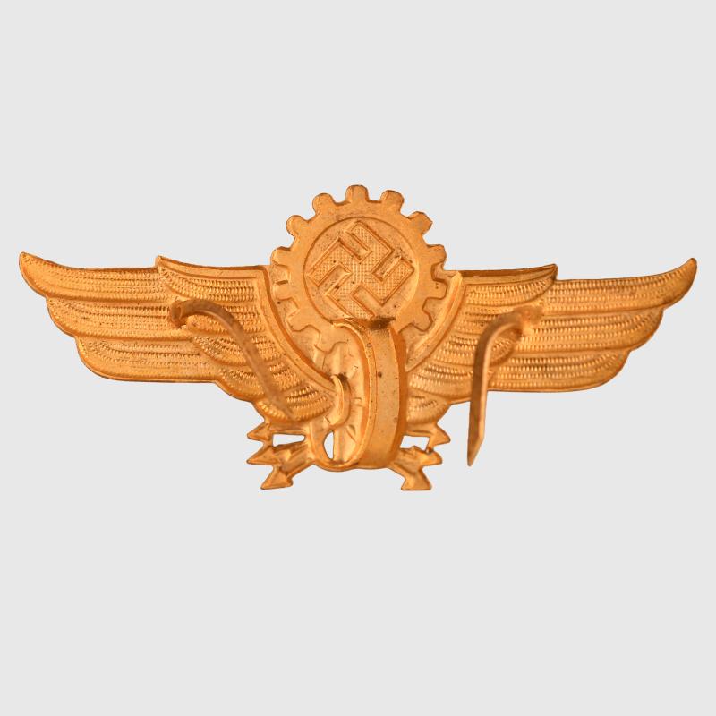 A scarce piece of insignia being the orivate and public tram service operatives cap insignia all in gilt showing the DAF cog wheel over a railway winged wheel. Both fixing pins present.