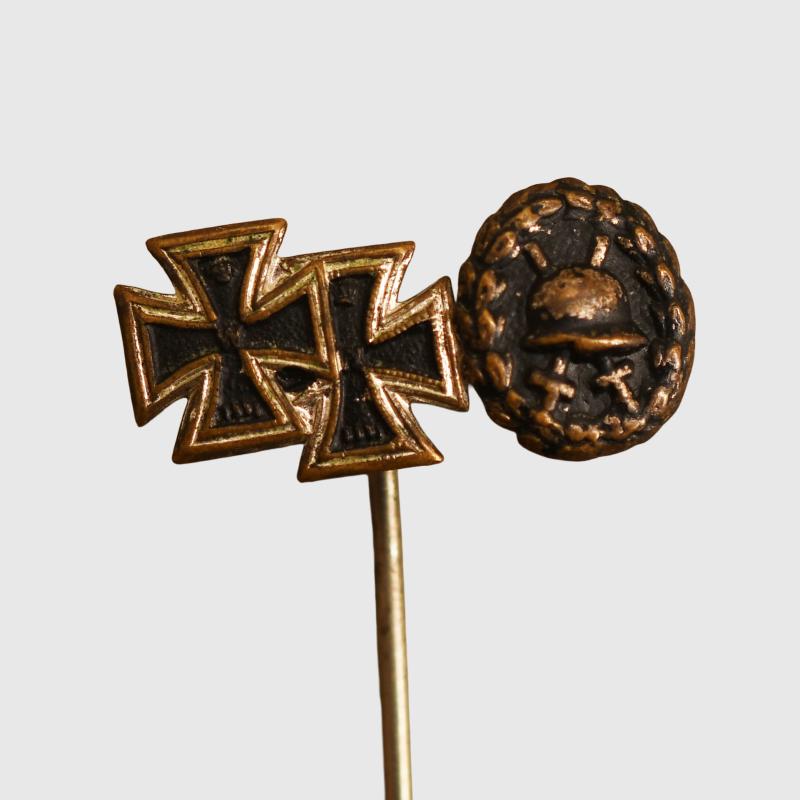 The two Iron Crosses and the Wound Badge in black fitted together on its twisted and grooved lapel pin fixing measuring 20 x 6mm.