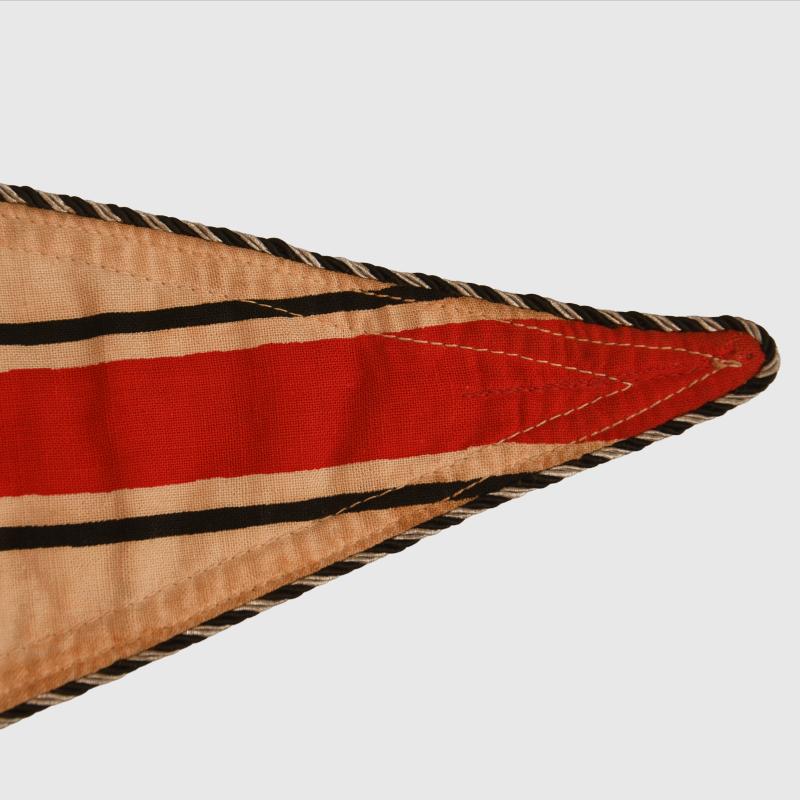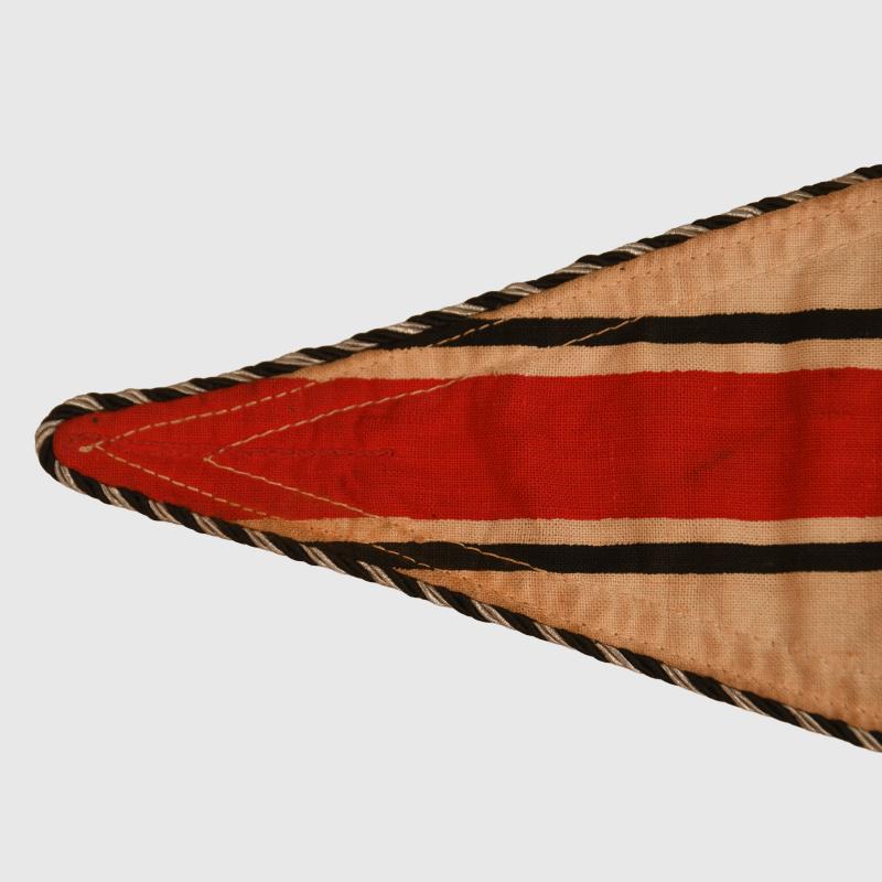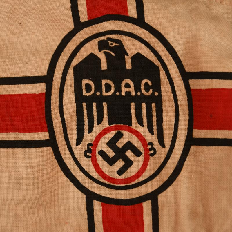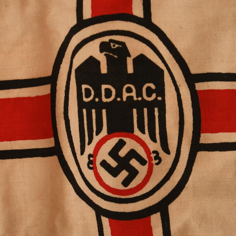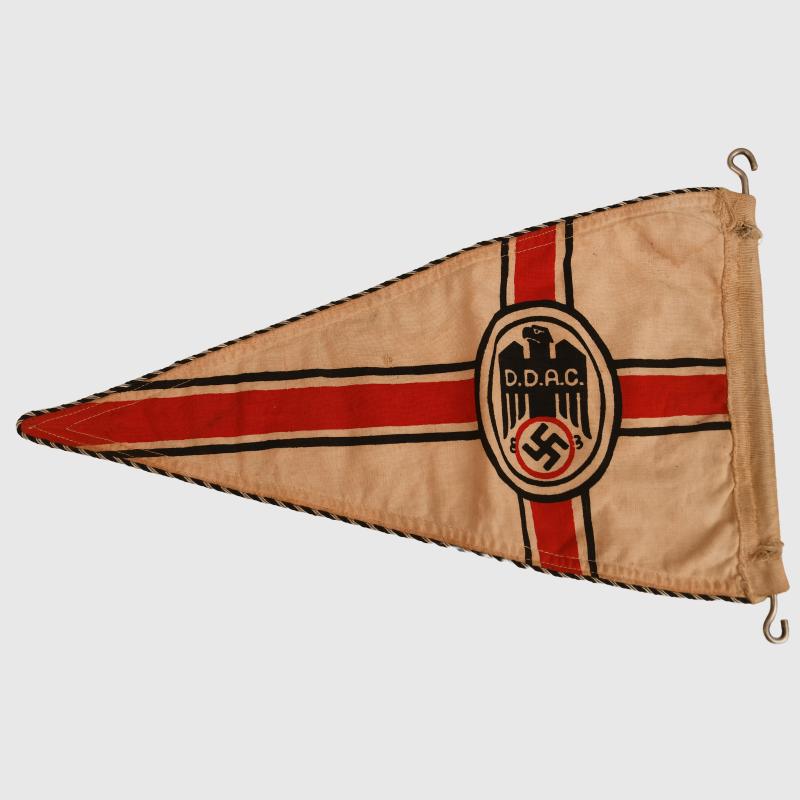 An unusual form of the DDAC car pennant, most that turn up on the collectors market are embroidered, this is printed but has the addition of black and silver twisted cord around the full triangular form edge. The twisted cord is of the type used by the NSKK. Slight shredding to the upper part of the selvage edge and minor storage staining.