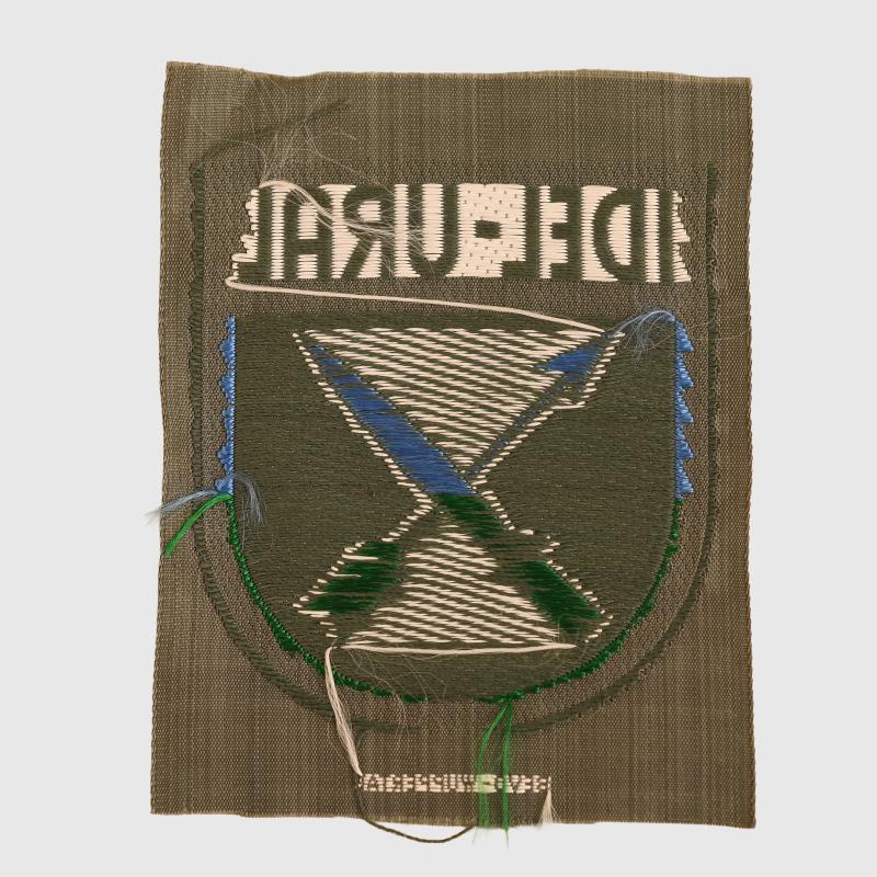 The volunteer sleeve badges created by Bevo Wuppertal are of the utmost quality and beauty in their machine weave. This example of the Idel-Ural, cut from roll. The Idel-Ural badge was the badge of the Volga-Tatar Legion of Volunteers for the German forces, mainly composed of Muslim Volga-Tatar but also included other Idel-Ural peoples.