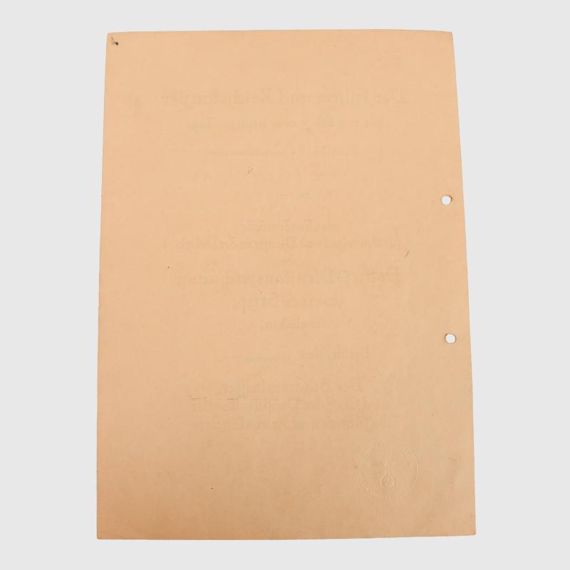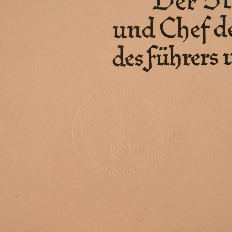 An impressive large A4 size pre printed citation, double punch holed, non folded, to Hauptwachtmeister Josef Stephan, awarding him on the 1st February 1939 the Police Long Service Medal for 18 years. State Secretary Meissner facsimile signature with eagle and swastika embossed lower left side of the citation.