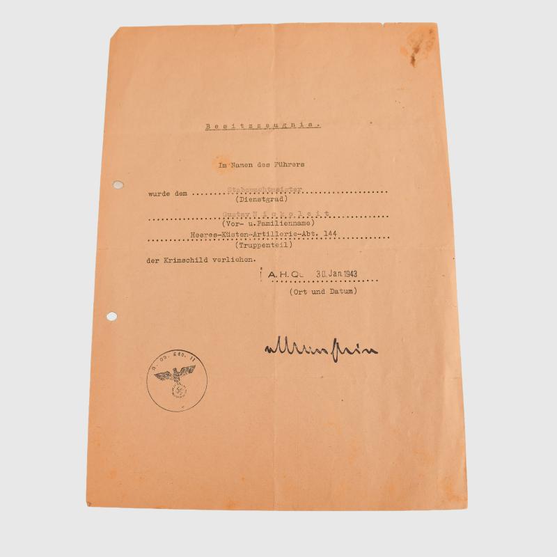 A good group to a member of the Army Coastal Artillery unit. Th Krim Shield citation is field typed on A5 size paper, folded twice, punch holed for filing, awarded to Stabswachtmeister Gustav Nickoleit of Army Coast Arteillery Abteilung 144, awarded 30th January 1943 with a facsimile signature of General Field Marshall Von Manstein. War Service Cross 2nd class with sword citation, standard A5 size, good quality paper, folded once, punch holed for filing, with a facsimile signature of General Field Marshall Ewald Von Kleist, dated 20th April 1943. War Service Cross 2nd class with swords citation, thick quality A5 size paper, punch holed for filing, non folded, awarded 20th April 1941 with unit stamp and signature of Major and Adjutant. This unit was based in the Crimea and was later part of the south Ukraine Army group, destroyed August 1944.