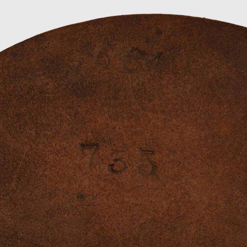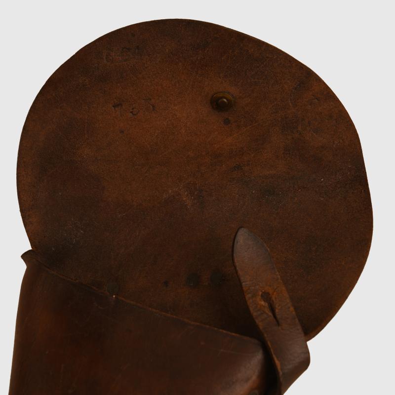 A very nice condition hard but supple leather brown holster for the Webley Mark 6 revolver, marked ‘HGR 1916’ on one of the belt loops. The holster is constructed in the naval rivetted fashion with two separate numbers stamped inside the flap of ‘664’, which has been partially erased and ‘735’ indicating that this may have been an issue holster.