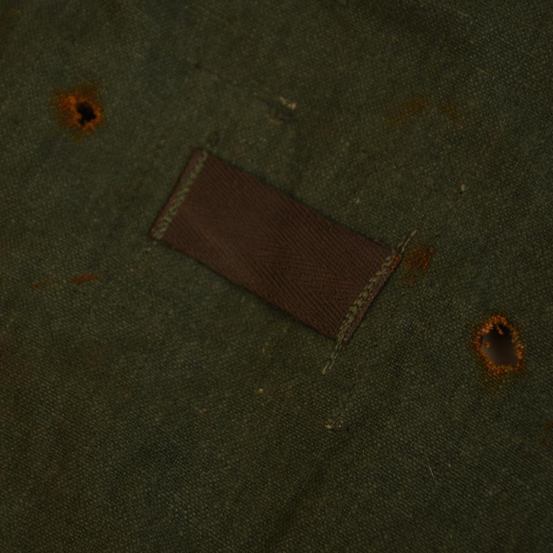 Green gas cape bag marked ‘PWB’ with number ‘3’ then the word ‘RATE’ all stamped inside the closing cover. The male/female closure studs have both rusted with one of the female sections of the lid missing, the male section is just about holding on to the main body. Loops on the reverse side for fitting to the gas mask strapping.