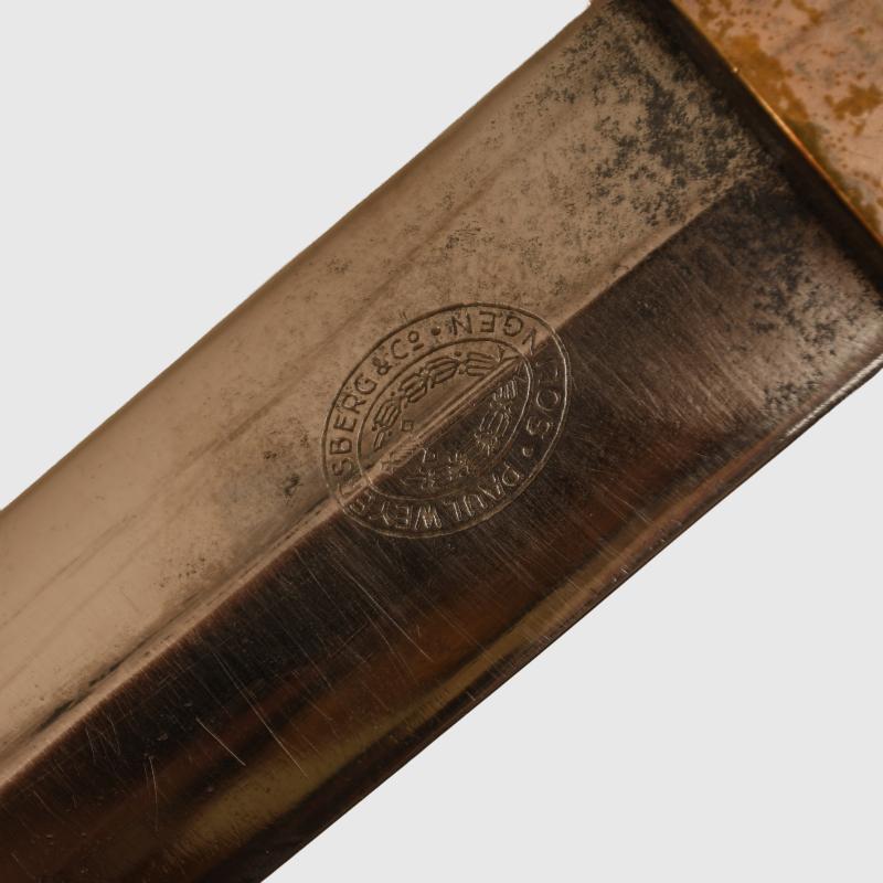 An example of the scarce RLB 1st pattern officers dagger, the blade has been polished, the Paul Weyersberg logo still good and clear, with its original grained blue leather washer. The leather covering both the grip and the scabbard good with just minor indentations, no leather rot. Complete with its RLB 8 pointed star insignia to the hilt. Slight rubbing of the original nickel plating to the cross guard area but generally good. All plating to the upper and lower scabbard mounts excellent. Missing its short leather strap. More extensive, extra images can be seen on our new Premium website, type in regimentalsmilitaria.co.uk in to your web browser. The sale of Knives, other Edged Weapons and Firearms are restricted to those aged over 18. Verification of age is required before purchase is concluded, this will include providing a scan of photo ID including your address and in some cases may require video verification by FaceTime or WhatsApp video, at Regimentals discretion, until formal laws on this requirement are enforced in the UK.