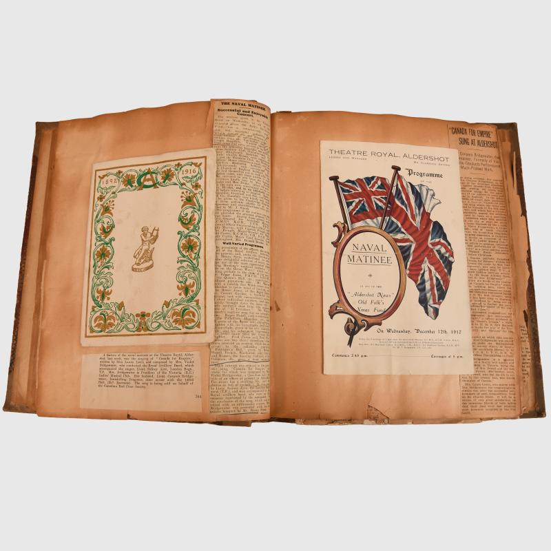 A superb scrap book and various other items of paperwork pertaining to the 143rd Battalion The Canadian Expeditionary Force. The 143rd were a bantam battalion of the Canadian Army, they crossed to France and fought on the Western Front during WWI. The scrapbook itself has been compiled by an adult who was closely connected with the regiment and particularly with the band, the scrapbook is approximately 2 inches thick and contains a huge amount of press cuttings of the period pertaining to the Battalion. There are many annotations, some menus, various invitations, paper clippings, a large size cabinet photograph of a well known officer of the battalion who was killed during the war, Lieutenant R.B.Powell, a well known Davis Cup tennis player. The portrait is of excellent clear quality, it shows the officer wearing the extremely rare Canadian 1915 pattern webbing officer set, this was produced by Mills and contracted to their Canadian Government, it clearly shows the copper bottom holster, the ammunition pouch, Mills belt with shoulder strap. There are three copies of Chevrons to Stars, this was the quarterly journal of the Canadian Officers School where other ranks were promoted to officers. There are two large photographs, one of the Battalion band and another that appears to be company of the Battalion, one of these photographs has a split towards the end, however it can be repaired and displayed easily. There is a separate notebook listing music issued to the Battalion band dated ‘July 1916’ inscribed to the interior ‘The Band President’. Within the grouping is a huge amount of research material and a comprehensive history of the Battalion and its activities throughout the war. The condition is good, there is foxing to the pages and typical fragility to the background page, however the printed matter remains clear and readable. There is also a copy of the Bantam Review printed at Sydney Camp in British Colombia on the 5th August 1916, to the front is a large photograph of the Commanding Officer of the Battalion, this souvenir book seems to have been compiled by a Violet Bridgewater who is probably the daughter of one of the officers of the Battalion, the name Bridgewater appears several times within the text found inside. Overall a huge amount of research.