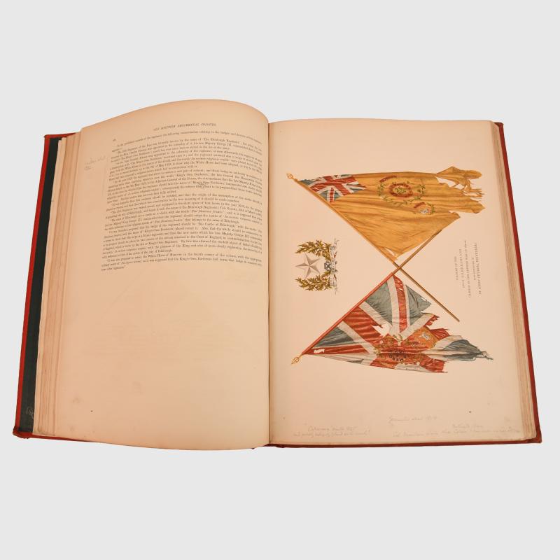 A very nice work published in 1885 individually numbered 100, unfortunately we are not aware of how many were printed of this fascinating large format hard bound work measuring 29 x 39cm, which contains 150 pages of text and line drawings relating to the regimental colours of Scottish regiments. 28 plates all in hand applied colour. Each regiment has its history included with the flags in full colour. There are quite a few pencil annotations throughout the book. Gilt printed to the outer cover ‘OLD SCOTTISH REGIMENTALS COLOURS BY ANDREW ROSS’. Overall condition of the book excellent with slight fading to the edges of the front cover.