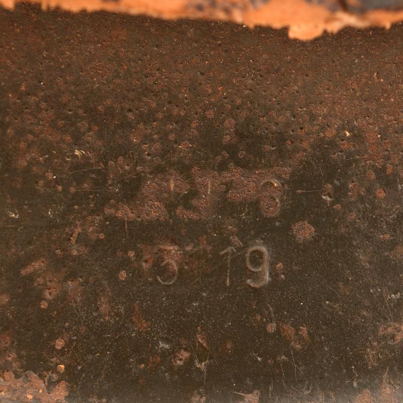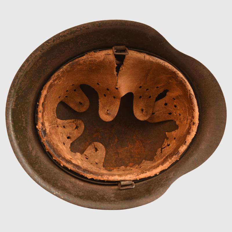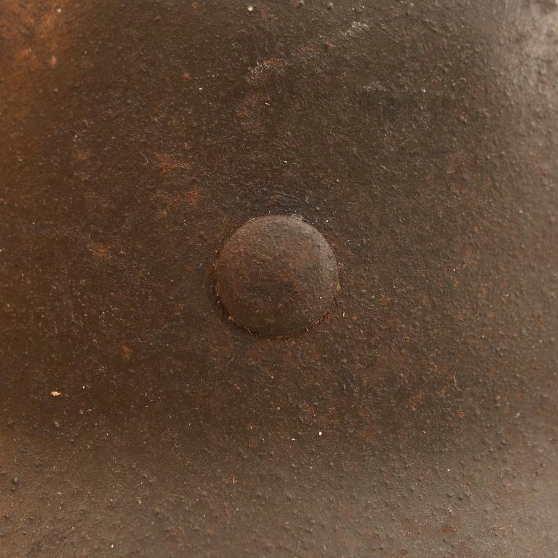 A large size M.42 shell, the stamped markings in the rear skirt are too difficult to decipher but on test the liner size would appear to be approximately 58 or 59. Army single decal good and clear with just minor abrasions. The paint finish of the remainder of the skull excellent with standard scuffs and markings. Some rust bleed to the interior lower skirt with more evidence of rust to the inner bowl. The original M.40 liner with its zinc band is still intact. The leather has been slightly affected by red rot and it has lost two of the tongues and one split to the liner adjacent to one of the strap posts, strap missing. More extensive, extra images can be seen on our new Premium website, type in regimentalsmilitaria.co.uk in to your web browser.