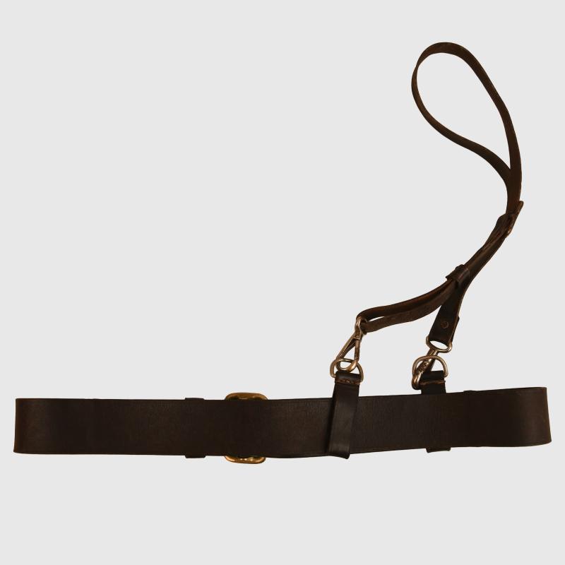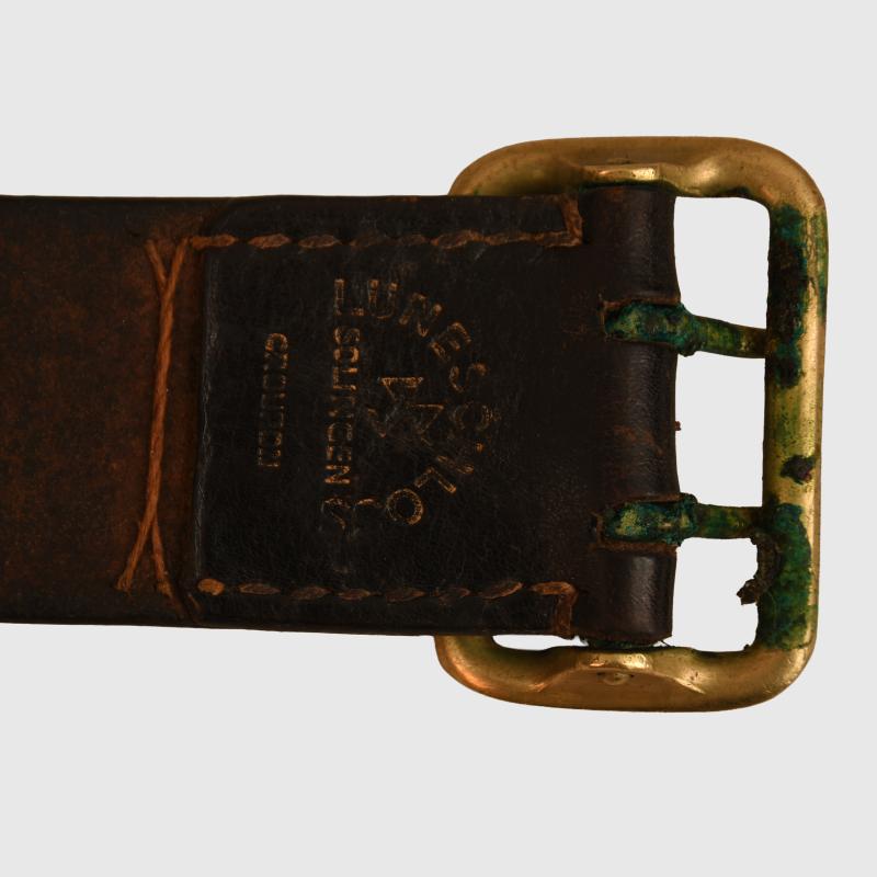 A nice example of the narrow style officer waist belt with double pronged belt buckle, the buckle has the political style of pebbles and is in gilded brass. The leather belt is marked ‘Lunschloss Solingen, with its runner and complete with its cross strap with reciprocating belt loop, which moves along the length of the belt.