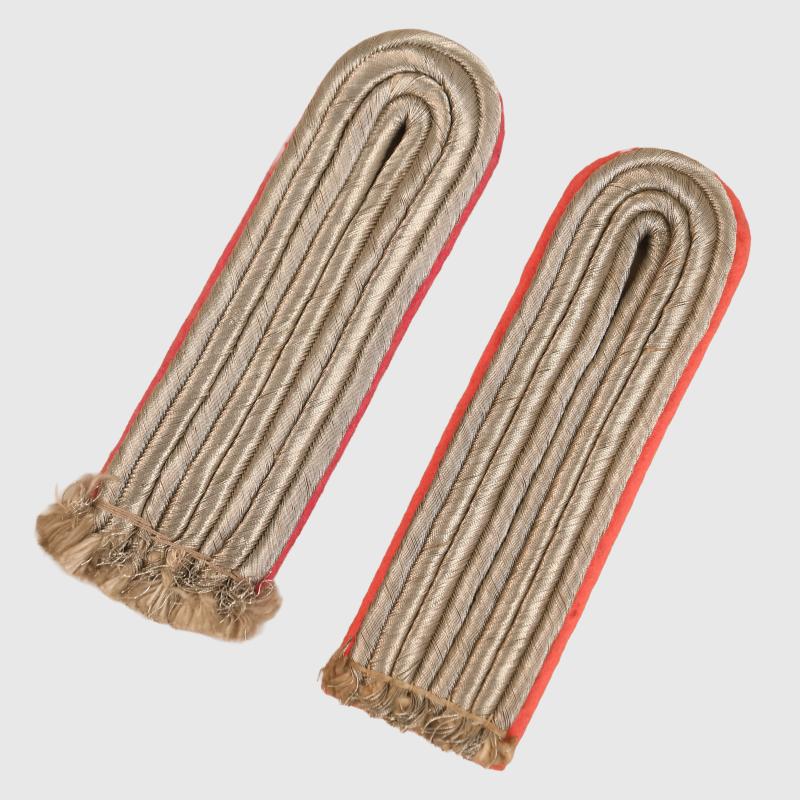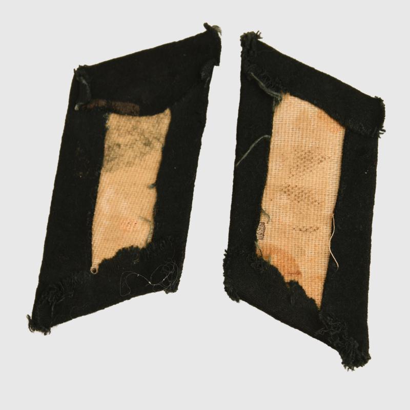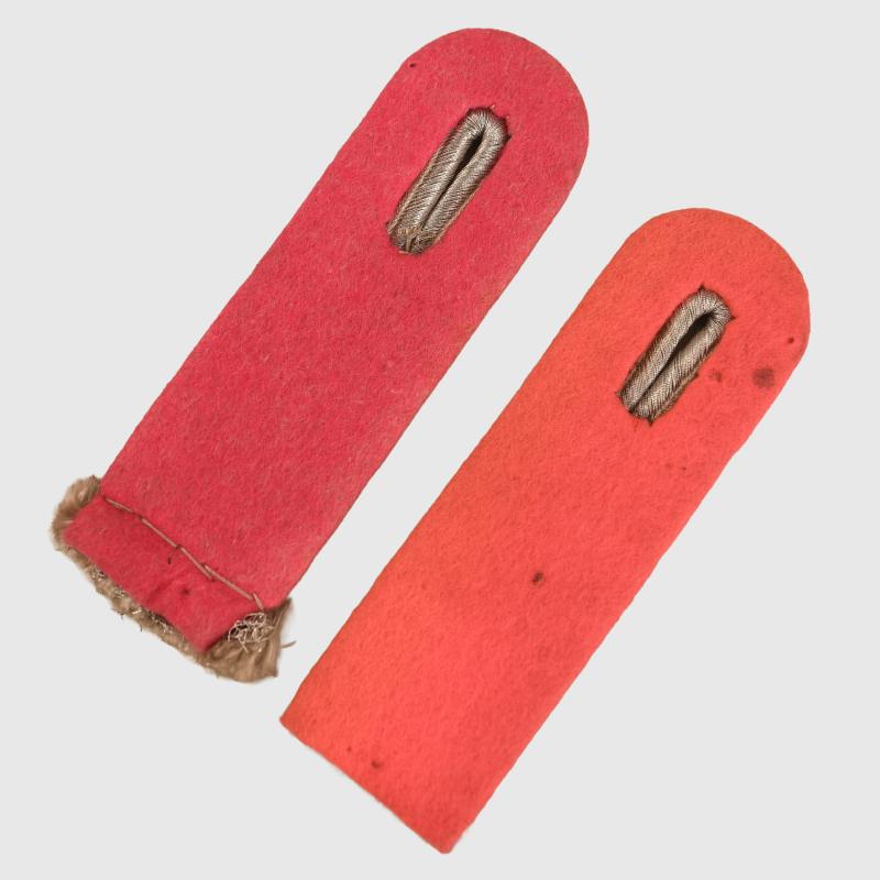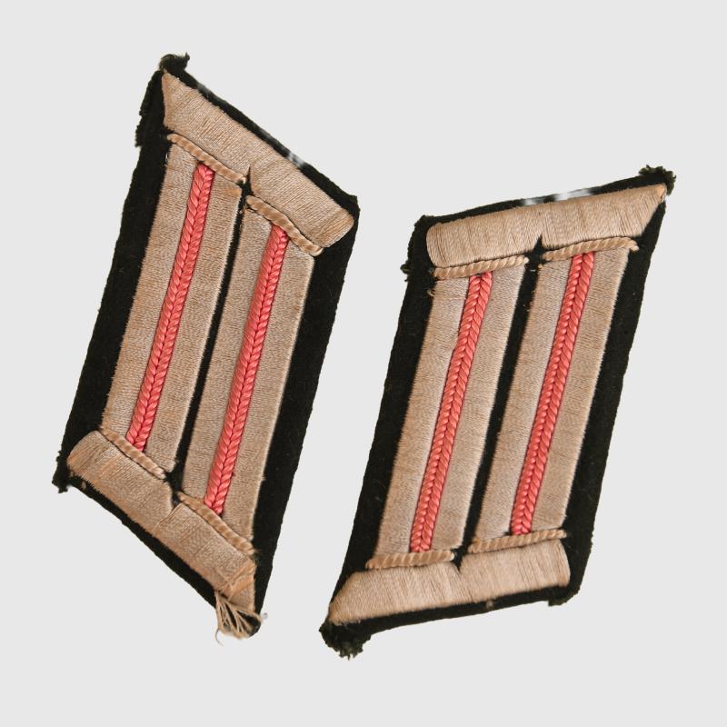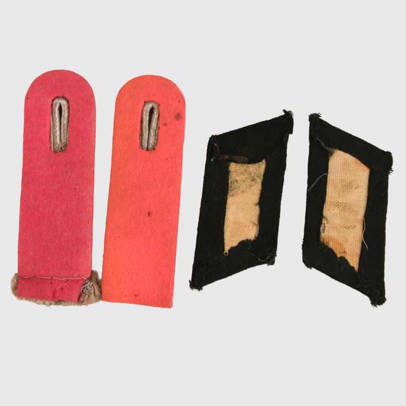 A matched pair of cotton embroidered pink centred collar patches for an Army M 36 tunic officers, with a mismatched pair of Army Lieutenant stitch in shoulder boards with pink underlay for Panzer troops.