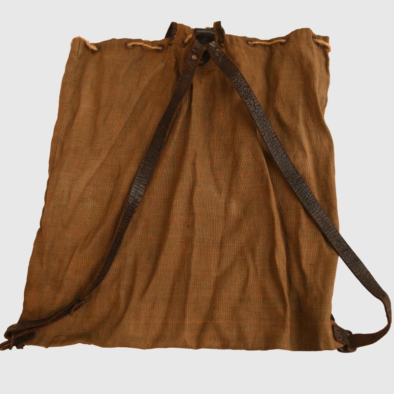 An unusual variation of the many back packs for the Third Reich, constructed from a slightly heavier weight of canvas, virtually identical in tone of colour to the police shako covers. Complete with its two leather shoulder straps, which hook to the base of the rucksack when slung over the back of the wearer. Neck closure drawstring to the back pack.