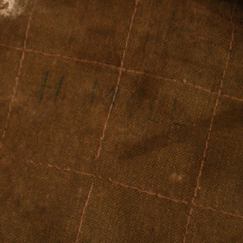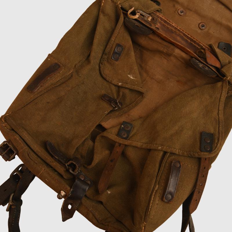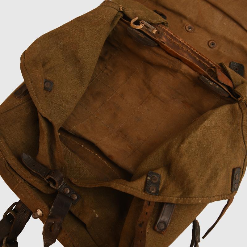 RB numbered to the leather at the reverse side of the pack. All leather strapping complete with all correct metallic elements. Stitching strong. Some slight mould to the olive drab on the reverse side. Fur good. All internal strapping complete.