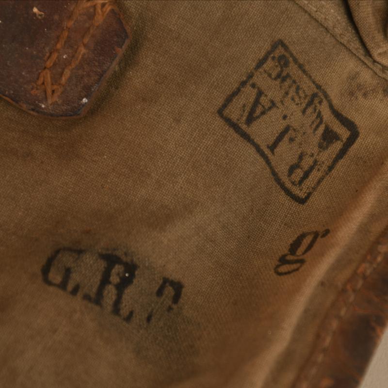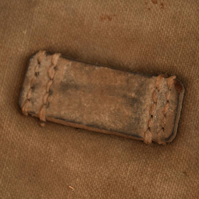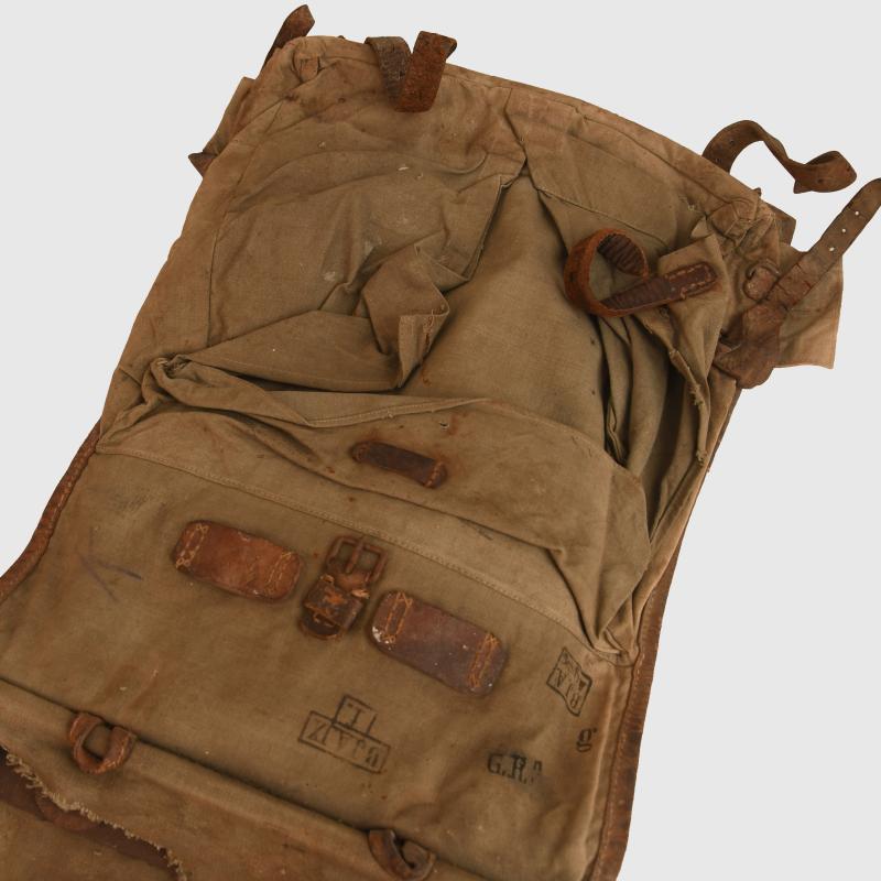 A good service used but complete and intact all field grey green canvas back pack. Profuse regimental and army group markings to the inside of the flap. ‘B.J.A.Augsburg’ repair depot ‘BJH’ ‘GR’ (Guard Regiment) marked with an indecipherable number, a further army corps number of ‘P.O.A.1X’. Some rodent