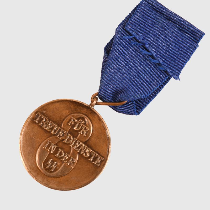 A cleaned and possibly lacquered example of the SS long service medal for eight years service, some slight edge knocks with its section of blue watered silk ribbon.