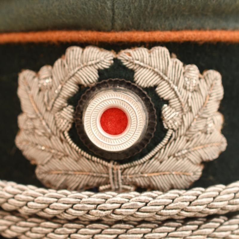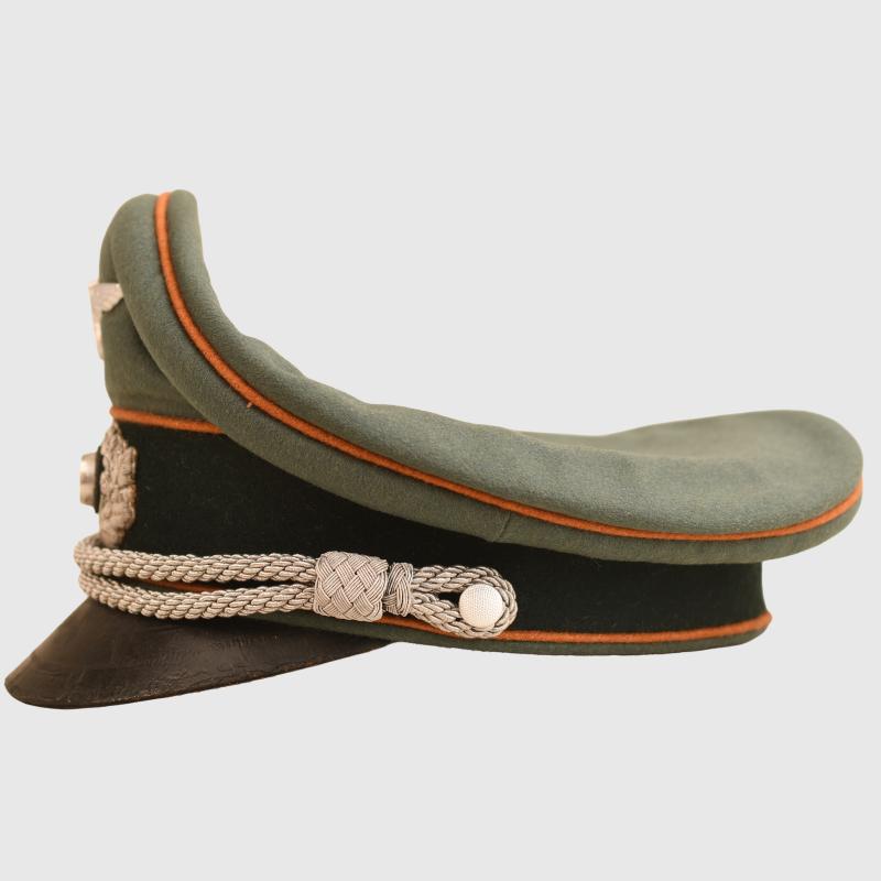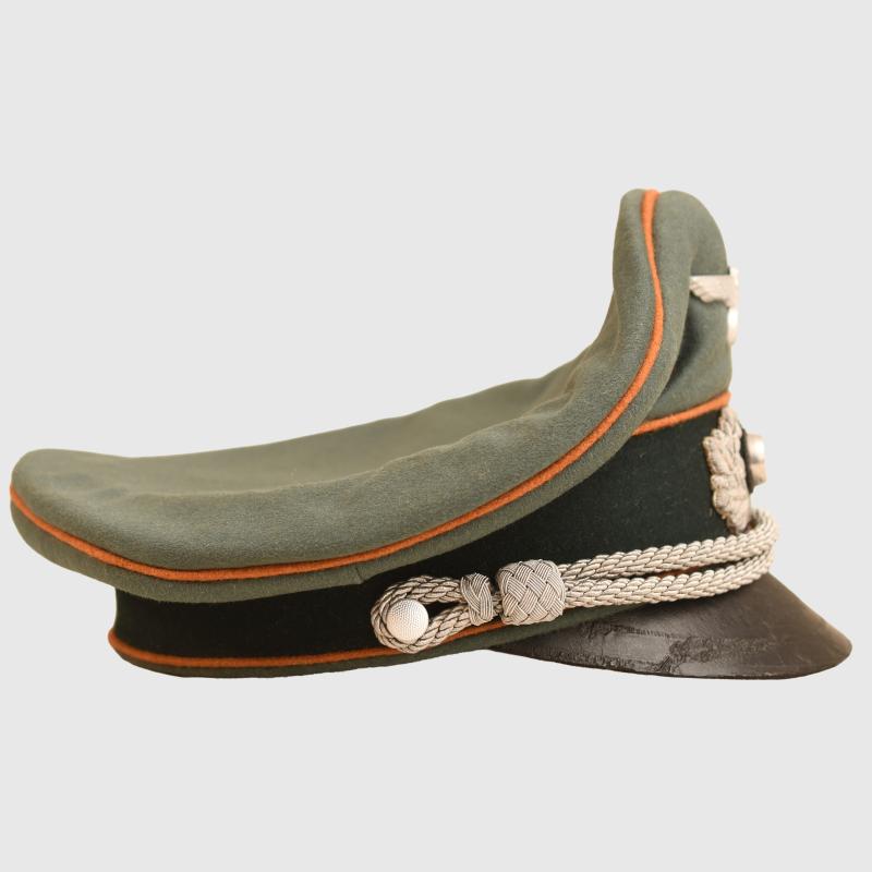 Non size stamped but on test it is possibly 57, constructed in soft Melton material. There is no moth damage anywhere to the crown of the cap, the copper brown piping standing proud against the field grey of the top of the cap and against the darker green to the upper and lower sections of the centre band, this piping was only worn up until early 1943. Stamped aluminium national eagle, bullion wire cockade with metallic centre, standard set of officers cap cords. Soft crushable peak. The interior sweatband in grey leather and has evidence of wear use. The interior lining in straight black without any indication of a central lozenge or makers mark ever fitted. More extensive, extra images can be seen on our new Premium website, type in regimentalsmilitaria.co.uk in to your web browser.