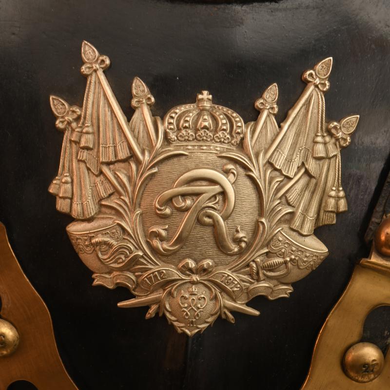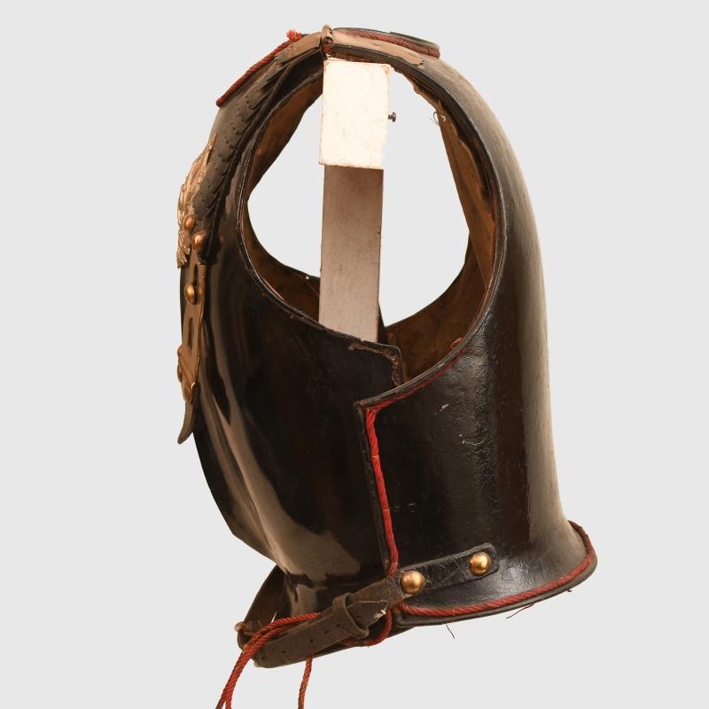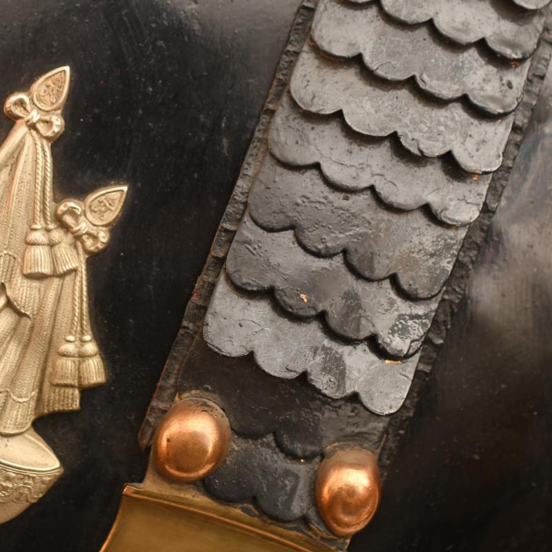 A generally very nice condition enlisted ranks or NCO all black cuirass worn by the Guard Du Korps. The red cording to the edges is loose in places but generally complete. All the black finish good and complete on both sides. The interior lining is complete and marked to the ‘5.E’ (6th Squadron). The front straps complete with the centre part of the strapping blackened with brass clips. The 2 studs to fit to the connecting straps are marked to the 6 c, To the centre of the cuirass is the 1912 added coat of arms with its original waist strap. A fine addition for a display with an enlisted ranks or NCO Guard Du Korps helmet. More extensive, extra images can be seen on our new Premium website, type in regimentalsmilitaria.co.uk in to your web browser.