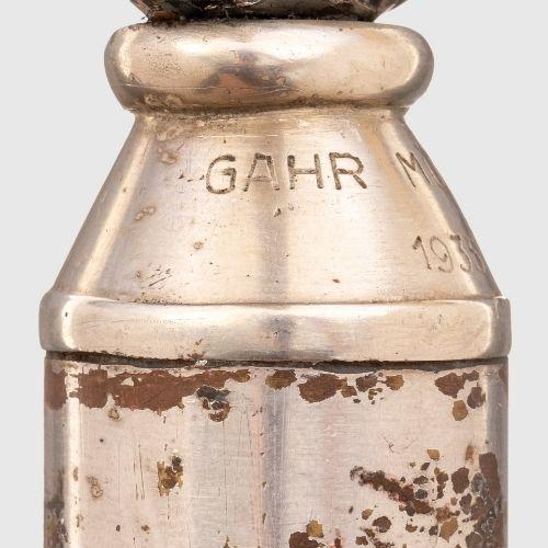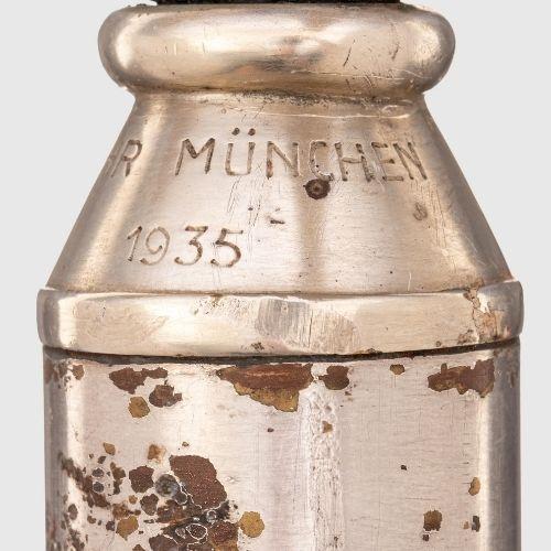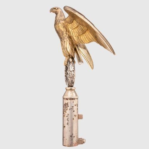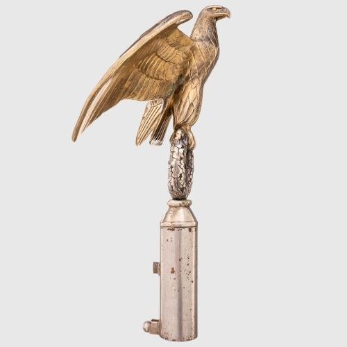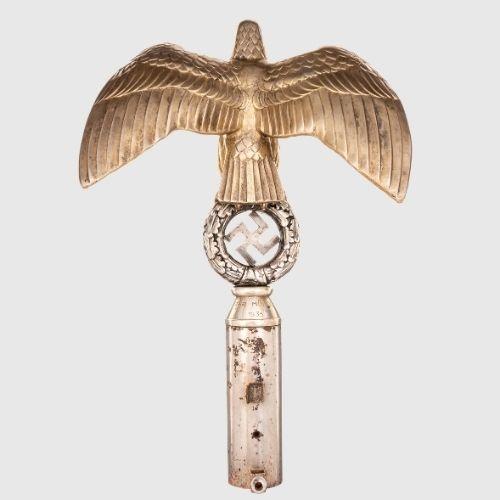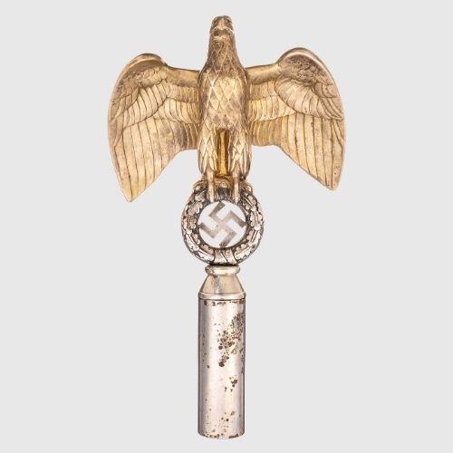 The Deutschland Erwache banner to many peoples eyes is the undying visual memory of the Third Reich, thousands of documentaries and still photographs have been made of the Nuremberg rallies, and in every photograph the Deutschland Erwache banner top is the most featured item. The origins of the banner go back to the 1920s, a wonderful sketch created in 1922 is shown on page 44 of the excellent work Deutschland Erwache by Ulric of England, the banners in the form that we now accept created in the middle 1930s, the first banners to be created were for foot units with the large Eagle swastika at its highest point, it was then realised that a further design for a slightly smaller eagle was needed for the mounted units for both the SA and the SS,and the NSKK this new redesign took place in the middle 1930,s. We offer here an outstanding condition example of the SA eagle known as the Reiter eagle, this this particular pole top has the unusual fitting unique to the SA standards at the rear for the fitting of the flag cloth support rail, gilt is good to the eagle although thin in places, the silvering to the lower tubing excellent, the base at the rear of the eagle has the standard Otto Gahr 1935 marking. Further reading on this fascinating subject of the Deutschland Erwache standards can be obtained by obtaining the magnificent work mentioned above by Ulric of England, and we take this opportunity to congratulate Ulric on this wonderful milestone publication. More extensive, extra images can be seen on our new Premium website, type in regimentalsmilitaria.co.uk in to your web browser.