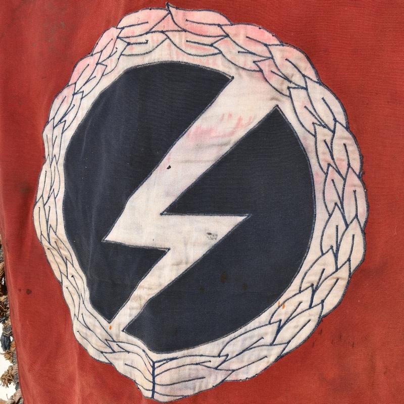 In all of our 50 years in handling items of military and political memorabilia we have only ever managed to obtain three of the British Union of Fascist banners and have never been able to obtain the banner top. This British Union of Fascists banner top measuring 50cm across the name box and 43cm from the base of the box to the point of the spear top. During the post WWI period the rise of fascism across Europe accelerated, it started firstly in Italy with Benito Mussolini’s march on Rome in 1922 with, at the same time, the fledgling NSDAP in Germany was growing in strength. In 1922 a sketch was made in Germany of the soon to be called The Deutschland Erwache Standard, the sketch in itself was possibly a copy of what the fascist Italians were already using, which they in turn had copied from the Roman legions. This British Union of Fascist banner top is a direct copy of those two nations political parties banner tops. Many images can be seen of this banner and banner top being used on marches in and around Great Britain by Sir Oswald Mosely’s British Union of Fascists, most notable is the 1937 march in London which can be seen in moving images on You Tube where the banner bearer is leading the march. On the outbreak of WWII Sir Oswald Mosely and his wife both the leaders of the BUF and other notable BUF officials were interned in the Isle of Man. After WWII the British Union, as it was then known, was reborn and these banners and banner tops were used again until the early 1950’s. Where and who by these banner tops and banners were made is unknown, it is estimate that no more than 60 were ever completed, the BUF did have one particular company that sourced a lot of their insignia and badges. The top and box are made of aluminium and constructed in a fashion very closely following the German name boxes on their Deautschland Erwache standards, but the British Union boxes were in a heavier material, the pole ends and below for suspending the banner itself are plated steel fittings a good degree of the plating still remaining although lifting in places, with the interim poles being in wood. The banner itself 82cm x 63cm that was hung from the pole of the banner top. The Red ribbed material backing cloth with applied laurel leaf with the central British Union of Fascist device of a white lightning bolt. The banner is edged with blue and white coloured thread tassels. The reverse has a plain backing cloth. The 8 suspension straps are all complete and are secured with two press studs to each loop. The banner has seen much service and it is with some slight discoloration of flooding of colour from the red backing material onto the white laurel leaf circlet to the centre, also minor staining of service wear but no damage, the wood pole is non contemporary. A Fabulous item of British Political history. More extensive, extra images can be seen on our new Premium website, type in regimentalsmilitaria.co.uk in to your web browser.