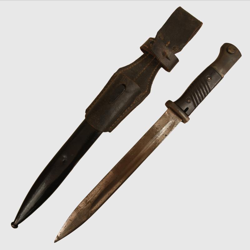 Standard K98 bayonet but without any Wehrmacht acceptance stamps. Excellent clean blade by Alcoso with upper fuller to the blade. Standard bayonet fixing. Bakelite grips undamaged. To the flat backed upper edge of the blade a waffen amt stamp with a small eagle with short wings. Standard steel scabbard, which has been repainted and its original frog, which is maker marked and dated ‘1941’. The sale of Knives, other Edged Weapons and Firearms are restricted to those aged over 18. Verification of age is required before purchase is concluded, this will include providing a scan of photo ID including your address and in some cases may require video verification by FaceTime or WhatsApp video, at Regimentals discretion, until formal laws on this requirement are enforced in the UK.