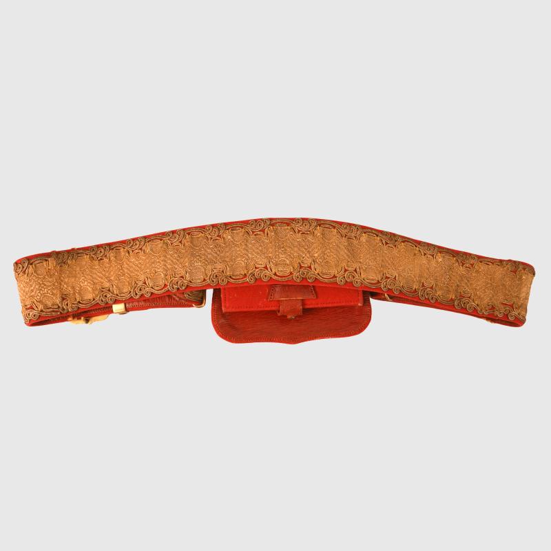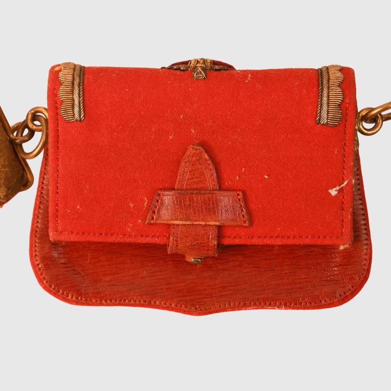 A near mint condition pouch and belt, the pouch itself is completely free of moth, red base cloth with the highest quality hand embroidery available at the turn of the 19th to 20th century. This is a Kings Crown pouch with its matching Kings Crown belt. All of the Battle Honours of the Regiment up until the turn of the century on the pouch. The gold bullion wire is virtually mint bright, with its two attachment clips. The cross belt has good bright lace with all of the gilt to the metallic fittings good and bright. One of the brass studs that secures the belt to the pouch is complete with the pouch but has come adrift from its fixing point. The owner’s initials of ‘P V H’ are applied internally to the red leather of the cross belt. The Regiment first raised as the Regiment of Light Dragoons in 1759 known as the 15th Regiment of (Light) Dragoons with subsequent service right up until after the First World War the Regiment was retitled 15th King’s Hussars and was amalgamated with the 19th Royal Hussars in 1922. The Regiment paid an notorious role in the notorious Peterloo massacre in August 1819 when within the bounds of the United Kingdom a 60,000 strong crowd calling for democratic reform charged the Yeomanry, the Hussars were ordered to charge resulting in 15 fatalities as many as 600 were injured.