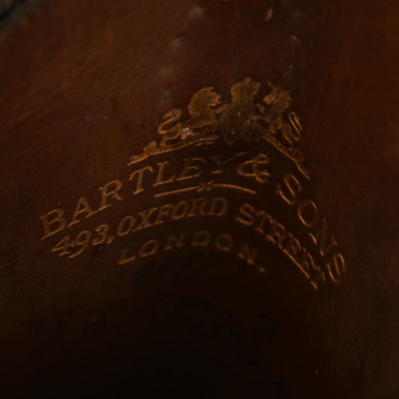 A quite worn pair of Hussar officers boots, the gilt lace around the top of the boot and the oval boss have dulled to a silver colour. Maker marked to the interior ‘Bartley & Sons, 493 Oxford Street, London’ with an owner’s name inside of ‘J S Wyam Esquire 13th Hussars’. The lace to the top of both boots slightly loose with some stitching as found. The shoe section slightly distorted, the boots need softening and reshaping. Please do not ask for sizes, these boots are not for wearing only for mannequin display.