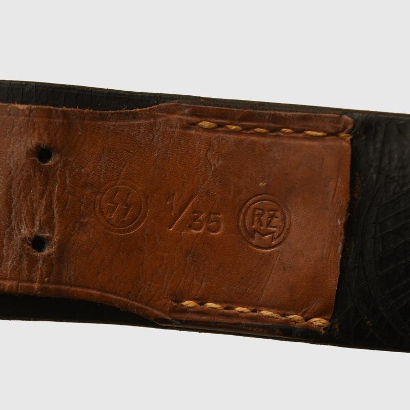 A 115cm long all black leather belt with its aluminium clip, one leather runner, its adjusting tab in brown leather, clearly marked ‘SS’ within a double circle ‘1/35’ followed by ‘RZM’ in a double circle. A rare accessory.