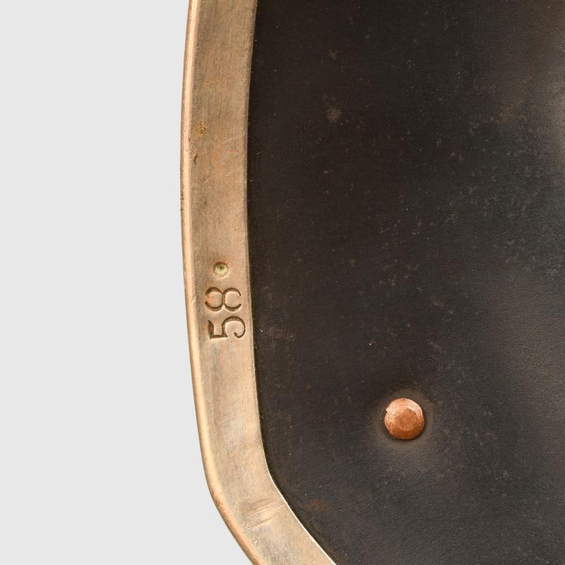 A very clean and large size 58 skull lobster tail helmet for regiment number 5 of the 13 Jager Zu Pferde regiments. Maker marked Wunderlich to the interior skull to the upper inner crown, all of the blued finish remaining to the lobster tail exterior, all of the fittings in white metal, ( the JZP regiments from 1 -7 were all in white metal fittings) with the exception of the brass domed clip over chin scales, the helmet with its totally original large size state and national cockades, to the rear inner lobster tail stamped size 58, with its original eight tongue leather liner, over the last 50 years we have had many of these helmets of the Jager zu Pferde, but can never remember having one that is regimentally marked, this example marked to Regiment number five and dated 1915, marked in ink blocks to the interior of the leather liner. More extensive, extra images can be seen on our new Premium website, type in regimentalsmilitaria.co.uk in to your web browser.