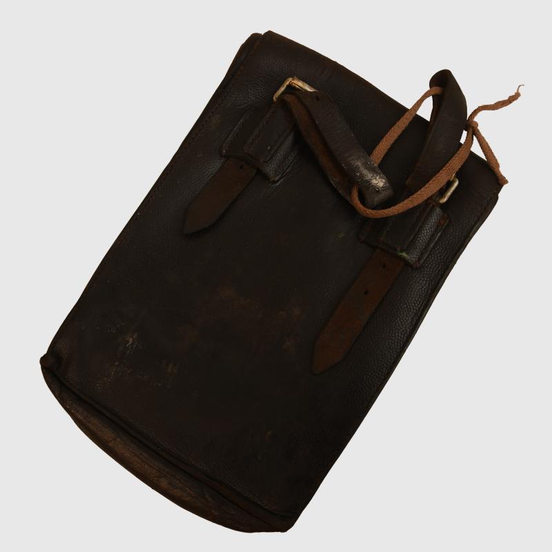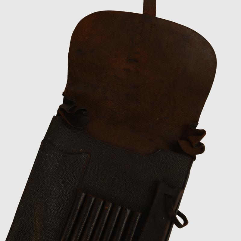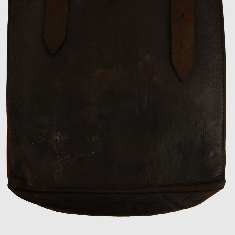 A well service used German officers map case constructed in the black pebbled leather, which has gone smooth in some places through wear. All the attachment straps are available on the reverse side. The front closing strap and buckle are complete.
