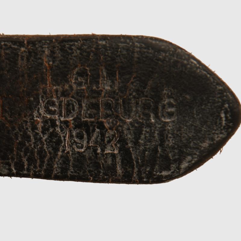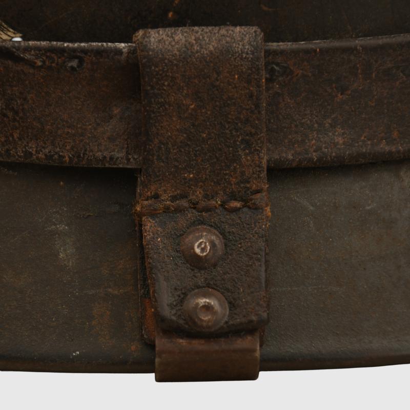 A very nice condition ‘ET66’ stamped shell, batch number ‘803’ Luftwaffe single decal combat helmet retaining all of its 1940 pattern blue grey colour. The Luftwaffe decal good and clear with just minor abrasions to the right hand wing. The paint has remained on all three liner retaining rivet heads. The liner in an absolutely superb colour, stamped size ‘58’ with the fragments of the original drawstring in place. Brown leather chinstrap, which is ‘Wutterpal’ maker marked with the 1937 date to the strap. A very ingenious soldier has created a carrying cradle out of a long buckled strap, a water bottle sprung loaded clip and two side clips out of metal and leather. Some parts of the surrounding strap of the skull a form of black composition material has been used to make sure that the cradle does not move and has left an indentation into the paintwork of the helmet itself. To the very tip of the long strap surrounding the skull is the maker mark and date of ‘1942’.