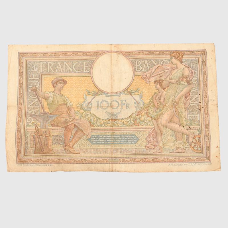 A nice and interesting group of items including French banknotes, letter set, issued tobacco, soap in tin, trench art lighter, oil bottle, Prinz Nez glasses one with lens missing, housewife spoon and fork, cigarette papers, mirror, toothbrush.