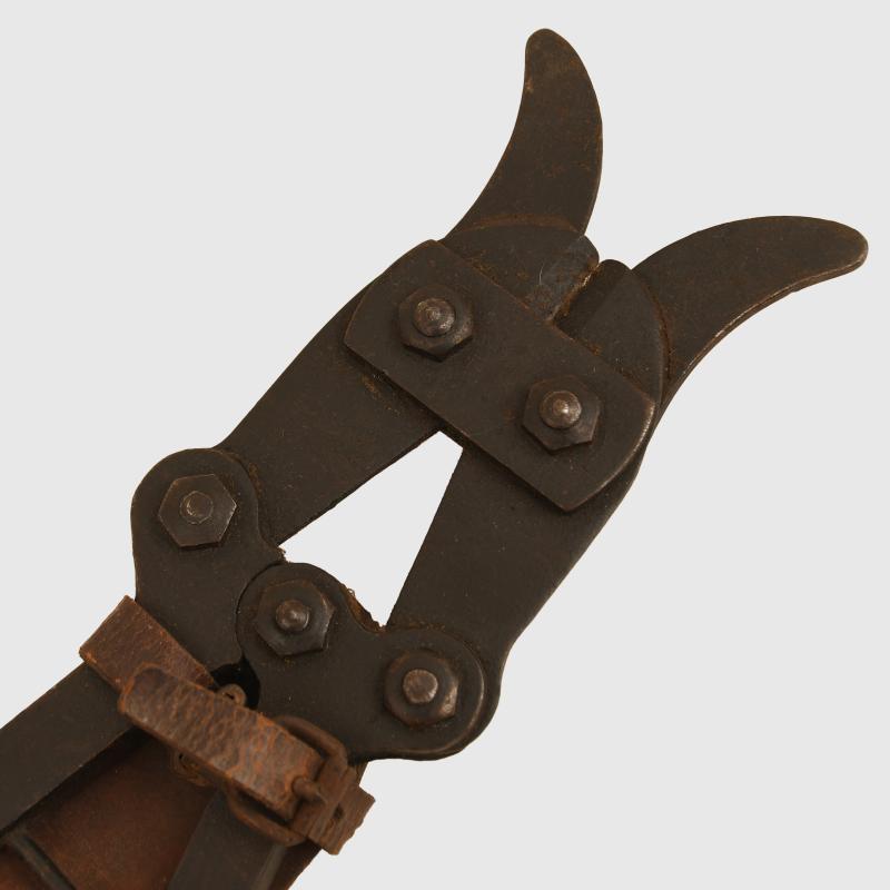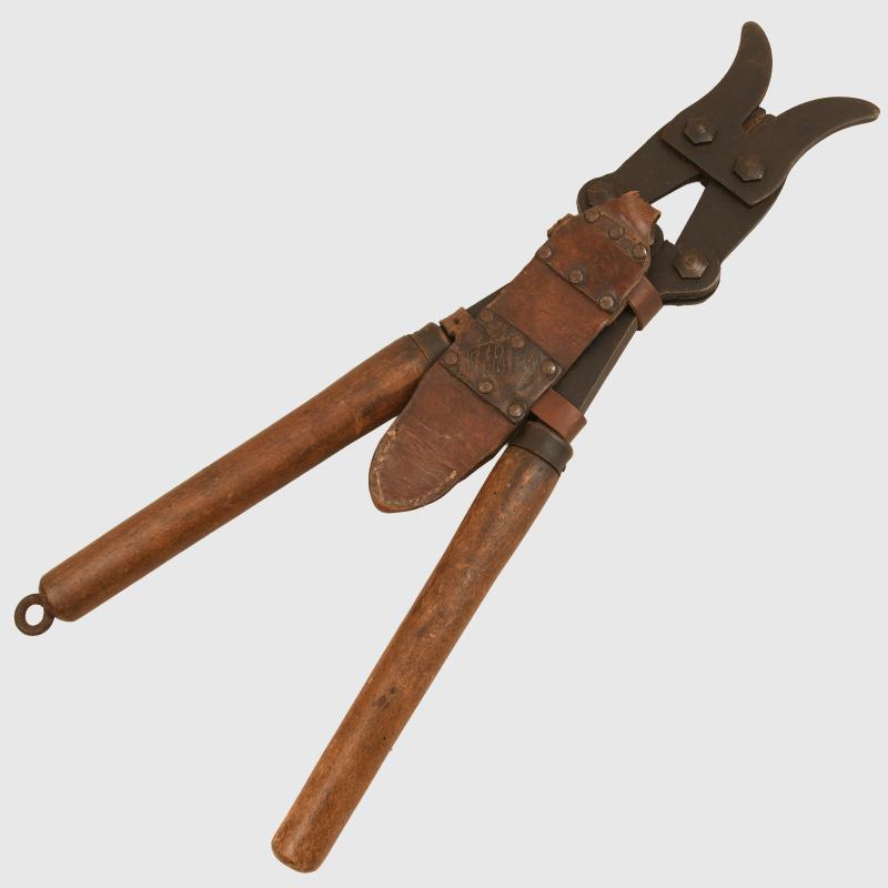 A nice condition pair of the well known Chater-Lea wire cutters. Manufacturers marking to one of the arms, all wood handles complete, fitted with its rare leather carrying frog. We have never seen the leather carrying system before.
