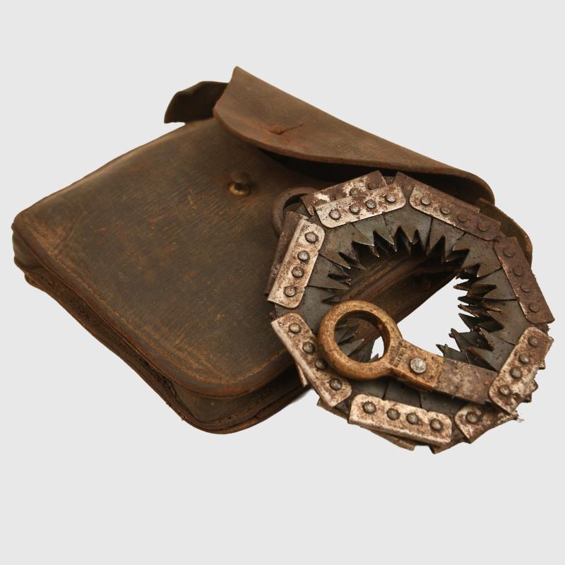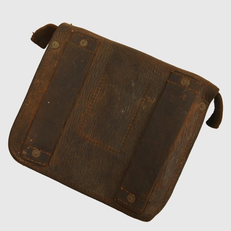These folding saws are normally encountered with World War I dates, this example maker marked 1940 dated, constructed in the identical grained leather as the World War I example with the folding saw to the interior.