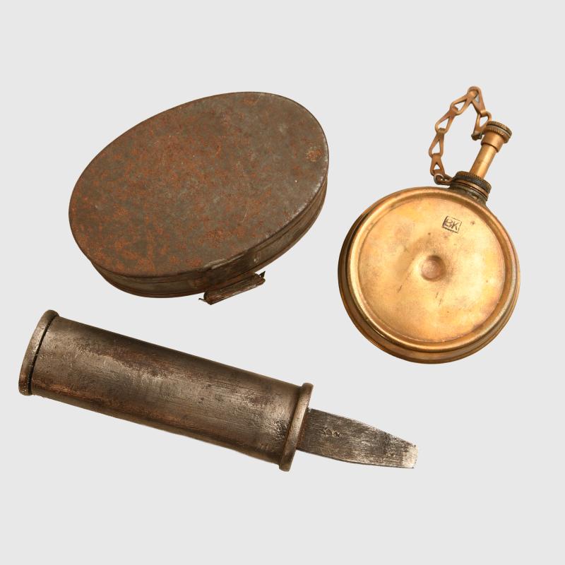 Group comprises a tin of popular soldiers grease, button stick, housewife issue shoe brush, combination tool for rifle, issue blanket whip.
