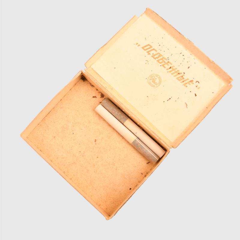 Lot includes matches, a banknote, two packets of cigarettes, a cigarette case, oil bottle, razor blades in Bakelite box and spoon.