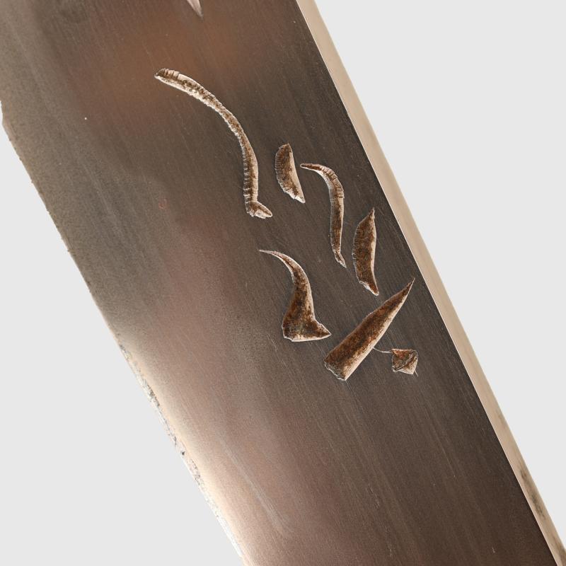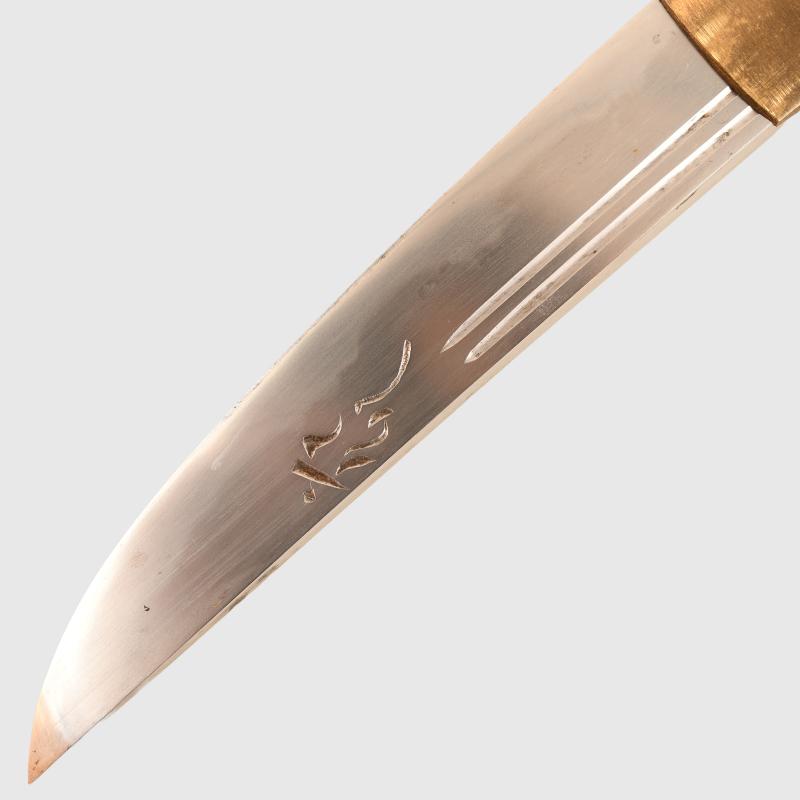 A lovely condition 22.5cm long dagger having a 13cm double fullered blade with a single signature to the blade. Nice yakiba, in its wooden shira saya fittings and including its original cotton sleeve. The sale of Knives, other Edged Weapons and Firearms are restricted to those aged over 18. Verification of age is required before purchase is concluded, this will include providing a scan of photo ID including your address and in some cases may require video verification by FaceTime or WhatsApp video, at Regimentals discretion, until formal laws on this requirement are enforced in the UK.