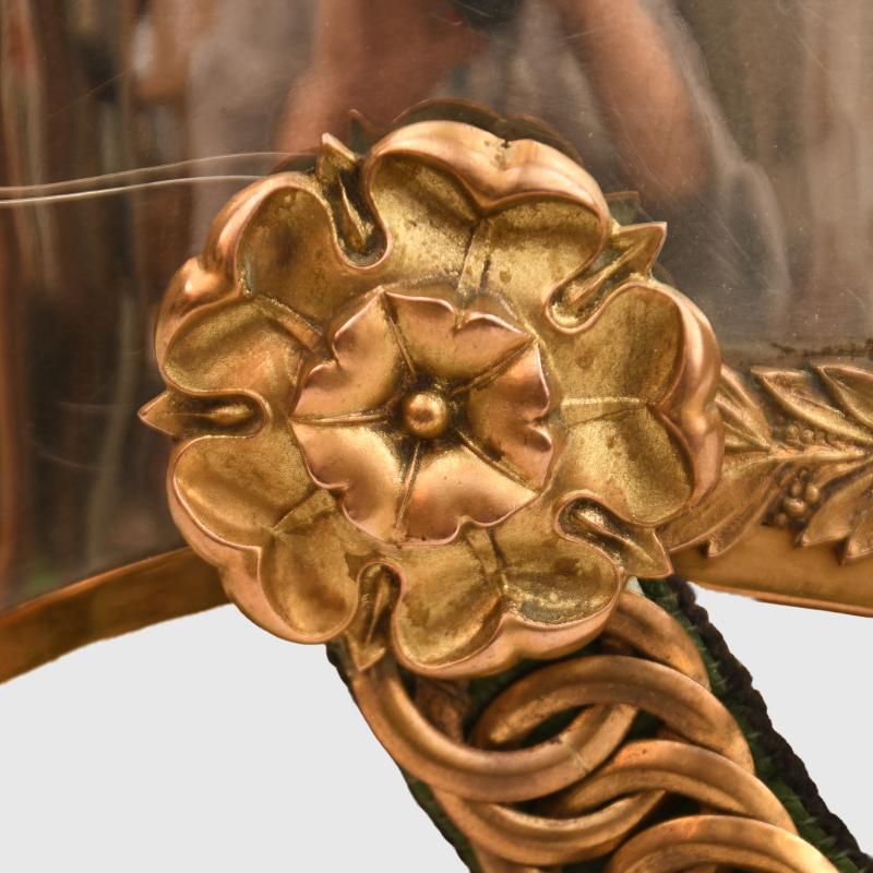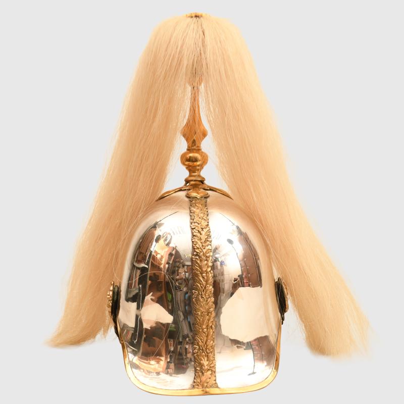 A fabulous example of the 1871 pattern all metal helmet worn by an officer of the Irish based 6th Inniskilling Dragoons. The skull near perfect, one minute crease just to the left hand side of the front plate. Gilding excellent overall, with its long officers quality white horsehair plume. To the centre of the Inniskilling Dragoon front circlet is the castle of Inniskilling in Ireland. Much recruitment for this regiment came from the local Irish population. A nice feature is that the chin chain backed in velvet has an inner colour of Irish green, the skull itself is very bright. Complete with its multi stitched interior liner, green leather lined to the front peak and the inner rear peak. It would be hard to better this example. And to a Regiment with a long and illustrious history.